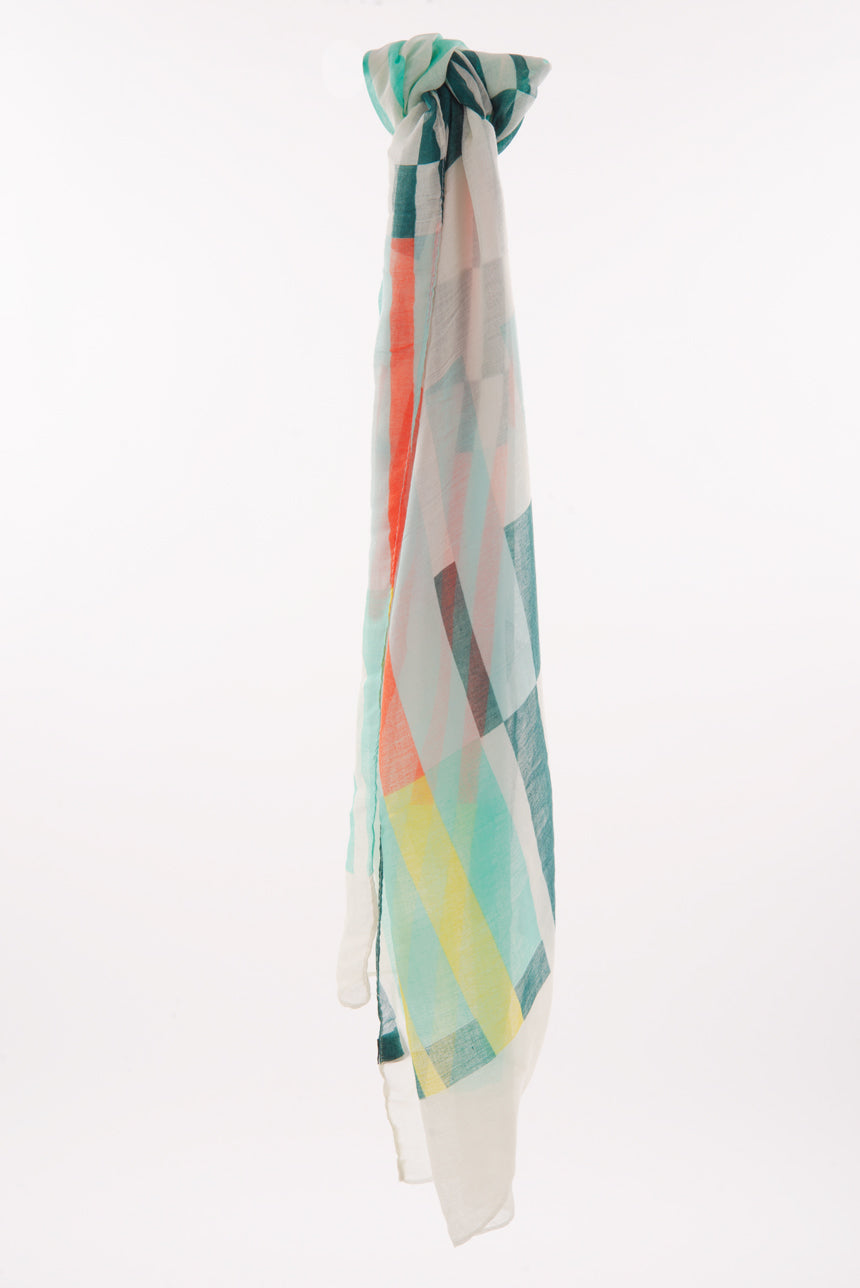 Foulard léger avec imprimés rectangulaires variés sur fond beige. On aime ses couleurs vibrantes qui lui donnent un « punch » incontesté.  Avec ses insertions de couleurs accent éclatantes, il ajoutera une touche funky et tendance à vos ensembles favoris ! Ce foulard pour femme est LE foulard parfait pour donner de l’éclat à vos looks !