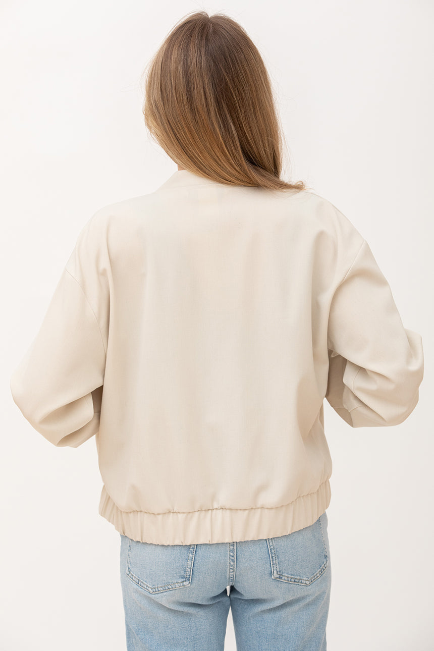 Blazer aviateur avec poches fabriqué au Québec. Tissu léger et confortable. Bande élastique à la taille et aux manches. On adore la douce teinte beige de ce blazer aviateur pour femme qui, loin d'être ennuyeuse, se porte avec style et élégance.