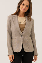 Le blazer en pied de poule brun arbore une coupe ample et confortable, rehaussée d’un revers de col cranté classique. Ses manches longues sont dotées de fentes et de boutons décoratifs, tandis que deux fausses poches passepoilées à l’avant ajoutent une touche élégante. Entièrement doublé au corps et aux manches, ce blazer offre un confort optimal, et les plis d’aisance à l’arrière garantissent une liberté de mouvement tout en maintenant une silhouette structurée.