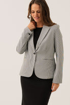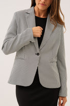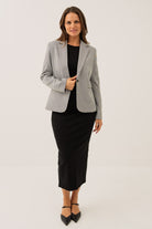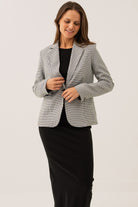 Le blazer en pied de poule noir présente une coupe ample offrant confort et liberté de mouvement. Il est doté d’un revers de col cranté classique, de manches longues avec fentes et boutons décoratifs, ainsi que de deux fausses poches passepoilées à l’avant pour un look soigné. La doublure au corps et aux manches assure un porté agréable, tandis que les plis d’aisance à l’arrière ajoutent une touche de sophistication et facilitent le mouvement.