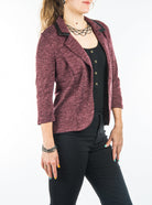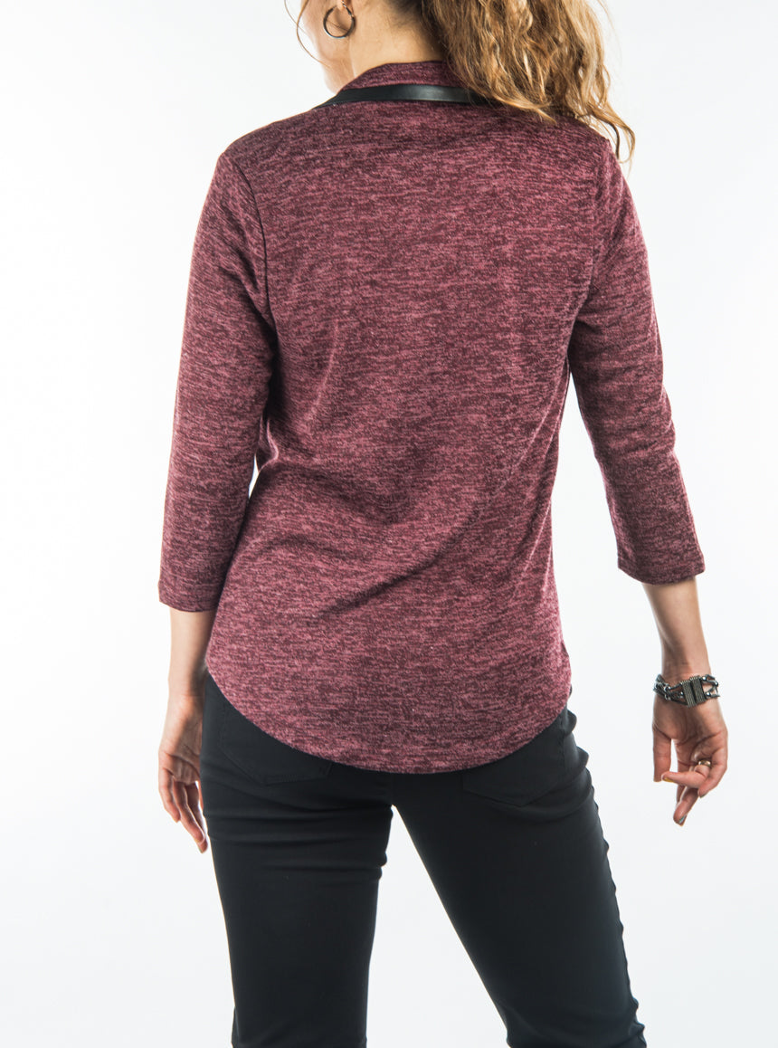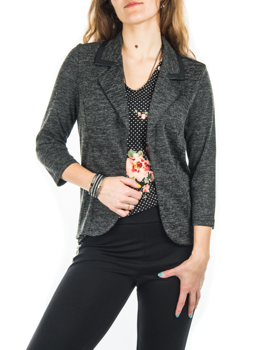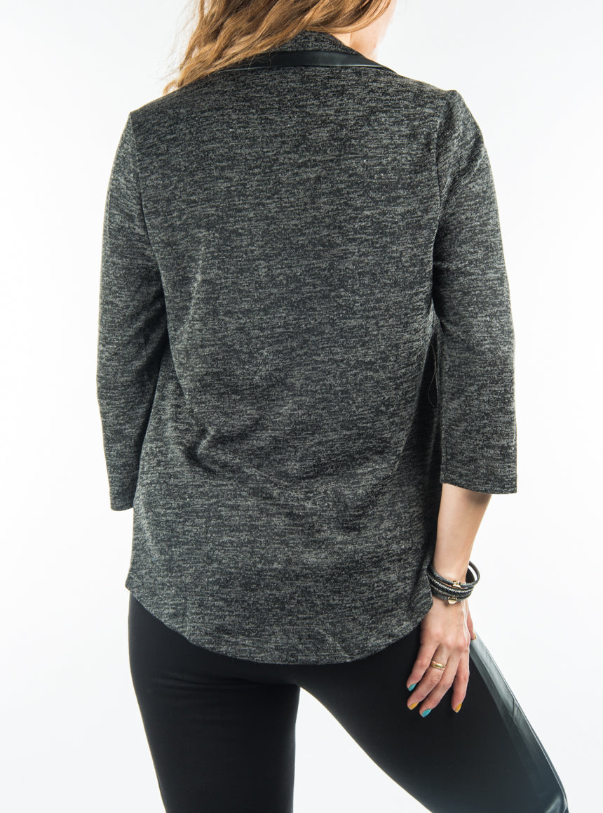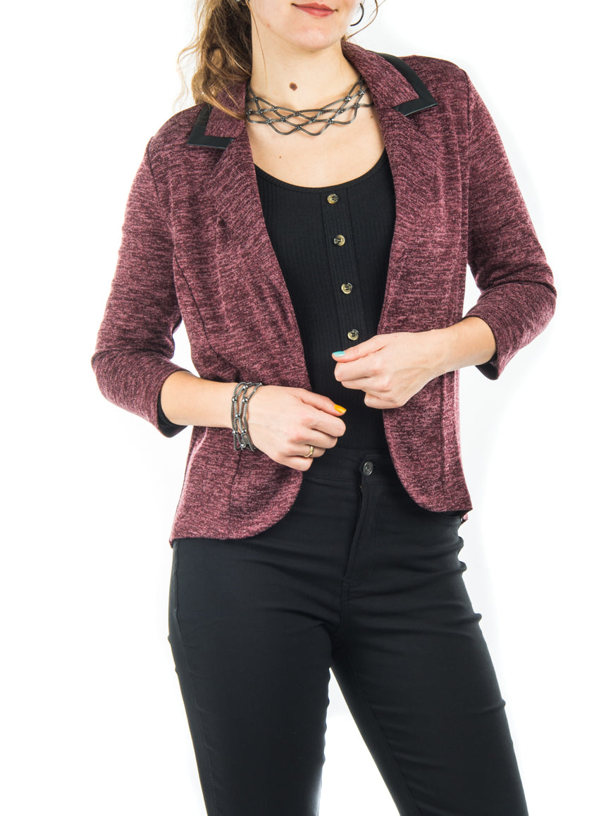Blazer Pentagone à manches 3/4. Bande de faux-cuir au niveau du col. Idéal pour le bureau, avec une jupe ou un pantalon.