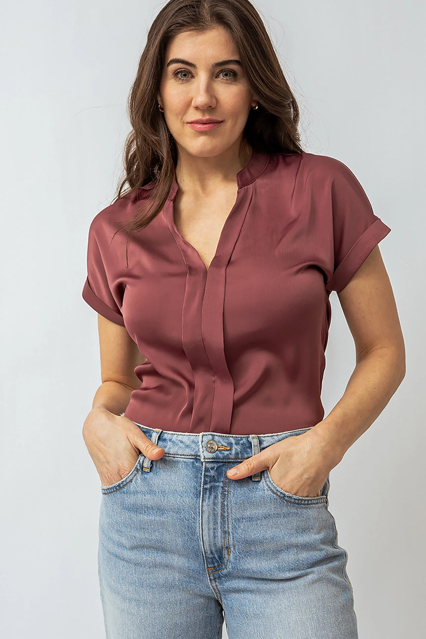 Sa coupe ample et son col mao moderne avec ouverture en V créent une silhouette décontractée, tout en restant élégante. Les manches courtes à revers ajoutent une finition soignée, tandis que le tissu fluide et légèrement satiné capte subtilement la lumière. Une pièce idéale pour un look professionnel ou un style chic sans effort.