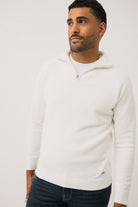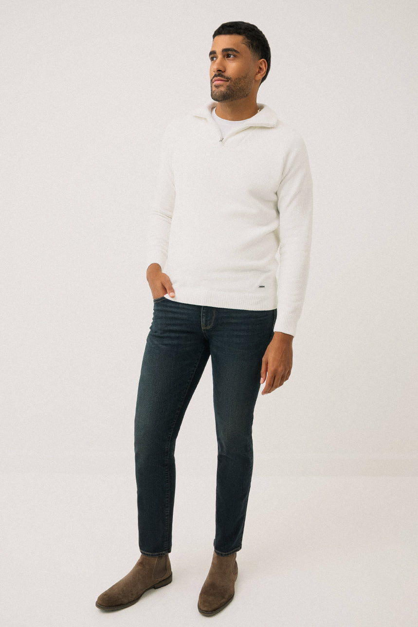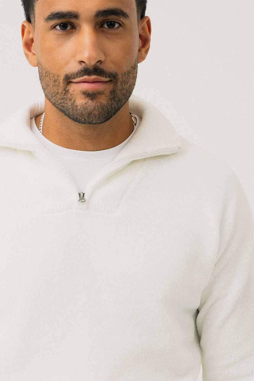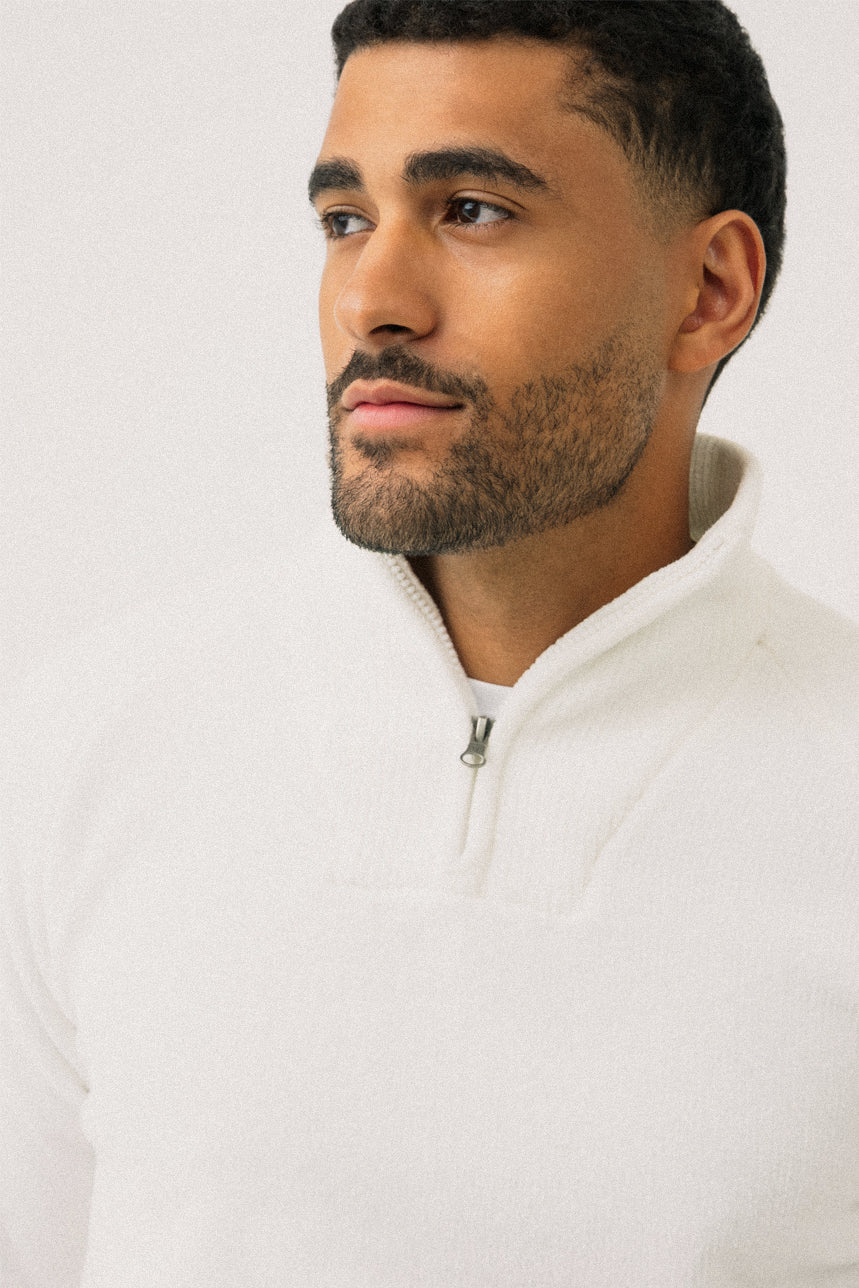 Le chandail en tricot blanc par Projek Raw allie confort moderne et allure décontractée. Sa coupe droite légèrement ample procure une belle aisance, tandis que son col montant muni d’une fermeture éclair au milieu devant ajoute une touche pratique et contemporaine. Conçu avec des manches longues raglan qui favorisent la fluidité des mouvements, il est complété par des bordures côtelées qui structurent élégamment la silhouette. Réalisé en tricot léger et extensible de laine micro-chenille, il offre une texture douce et agréable au toucher, parfaite pour un port quotidien avec un maximum de confort et de style.