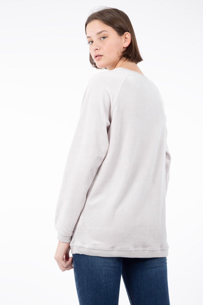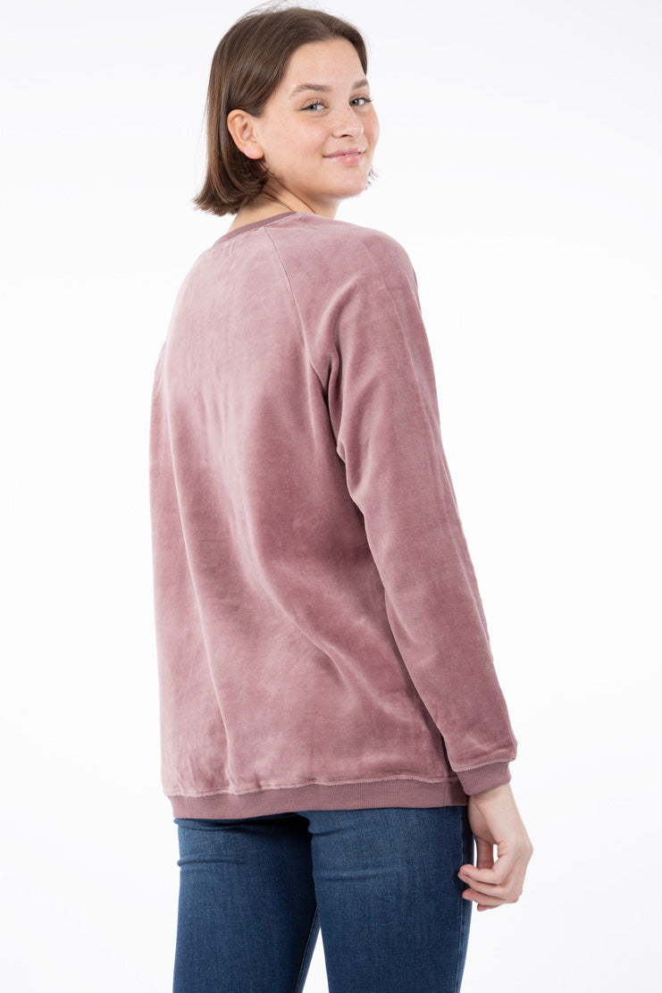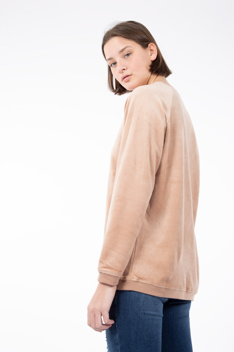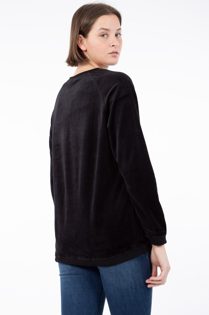Chandail détente col rond en velours pour femme. Bordures côtelées au col, aux poignets et à la base. Tissu léger et extensible. Disponible en 4 couleurs. Soyez confortable et stylé toute la journée avec ce chandail ample pour femme.