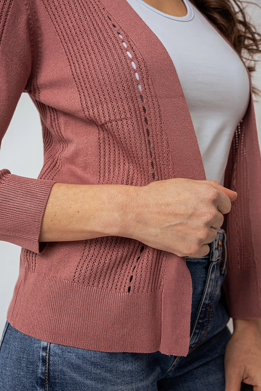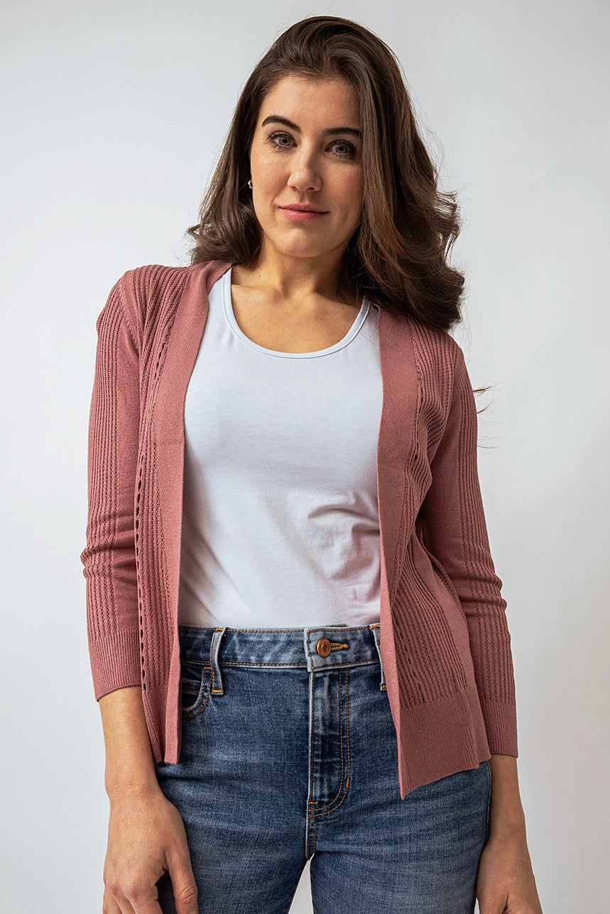 Ajoutez une touche de raffinement à vos tenues avec le cardigan ajouré en crochet. Sa coupe régulière et sa forme ouverte offrent une silhouette fluide et élégante, tandis que ses manches ¾ et ses bordures côtelées apportent une finition soignée. Conçu dans un tissu extensible, ajouré et léger, il est parfait pour superposer sur vos looks préférés avec style et légèreté.