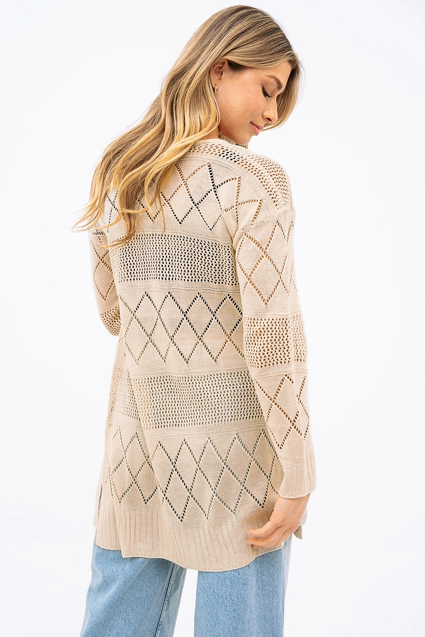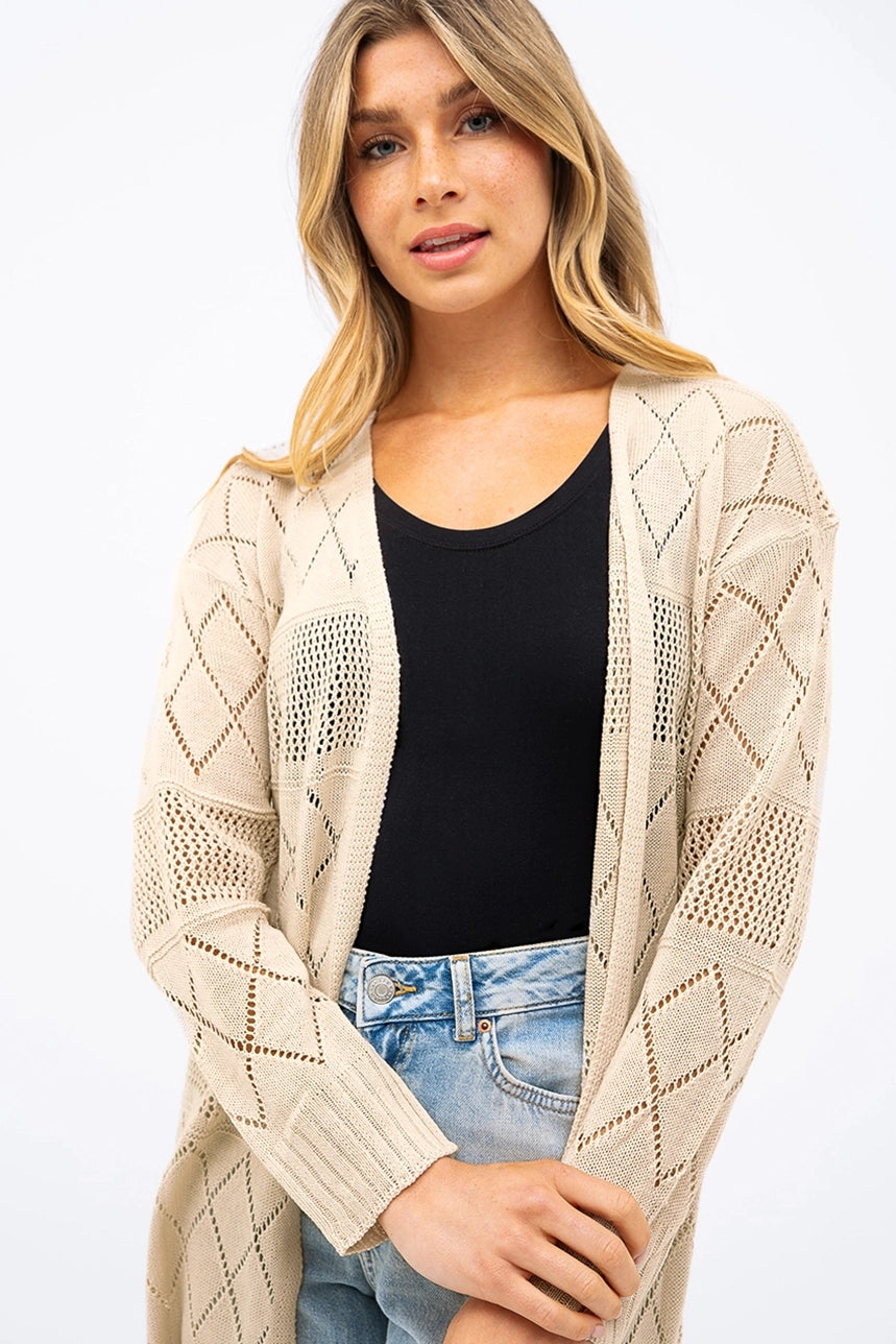 Ce cardigan uni en crochet est un indispensable de mi-saison, alliant confort et élégance décontractée. Sa coupe ouverte et sa longueur mi-cuisses créent une silhouette fluide et flatteuse, parfaite pour superposer sur vos tenues du quotidien. Confectionné dans une matière douce et légère, il offre un port agréable tout au long de la journée. Avec ses manches longues et sa texture ajourée, il est idéal pour les fraîches soirées d’été ou les journées plus douces.