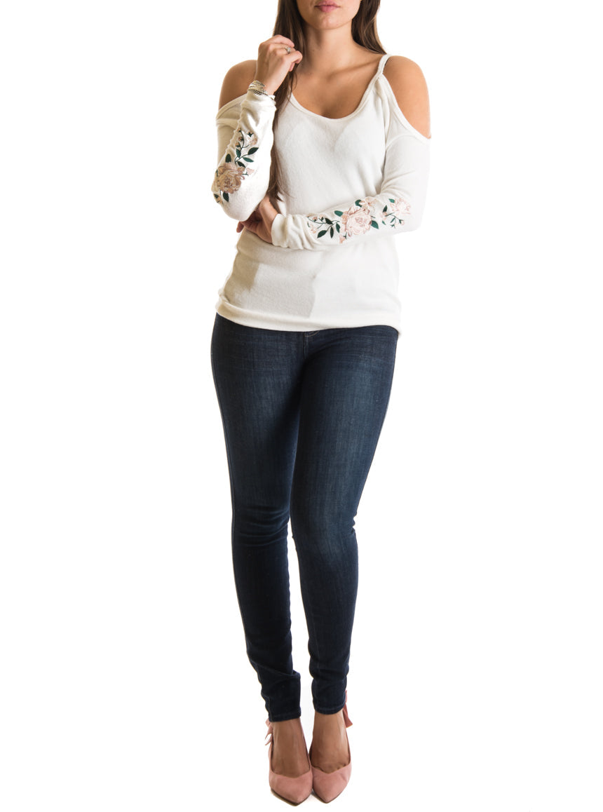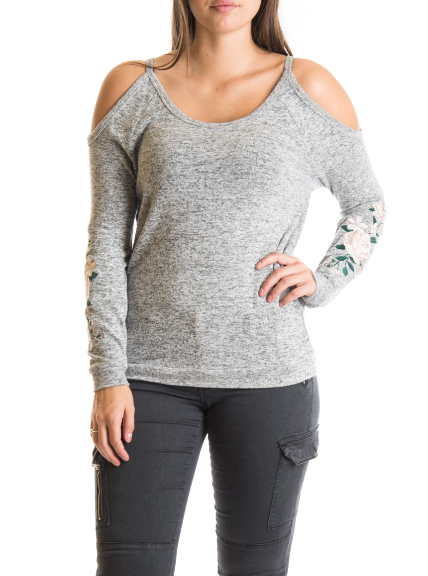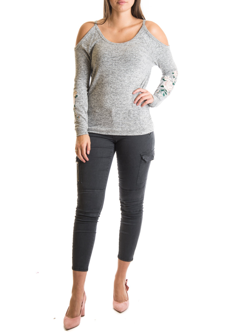 Chandail Pentagone en tricot à épaules dégagées et broderies florales aux manches. Tissu doux et confortable. S'agence parfaitement à un jeans, un pantalon ou encore une jupe.