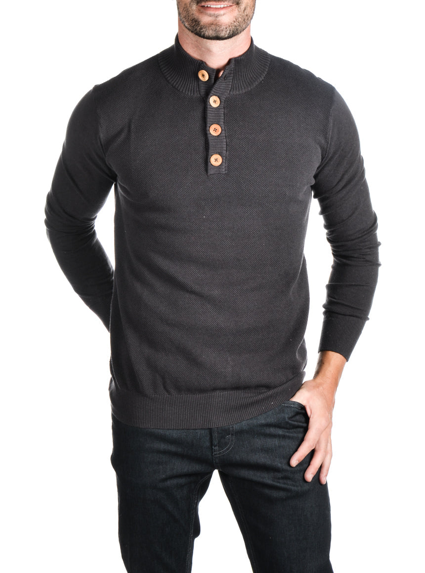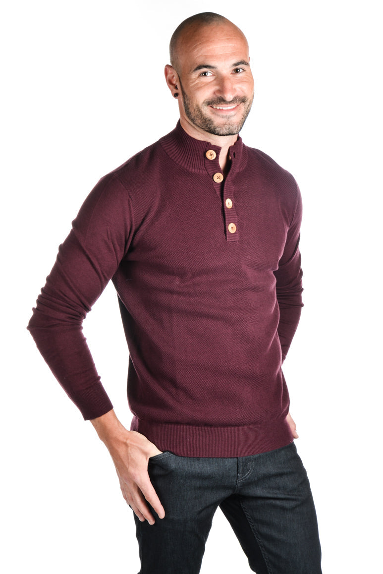 Chandail Pentagone en tricot à col montant et boutons de bois. Idéal avec un pantalon pour le bureau ou les sorties entre amis.