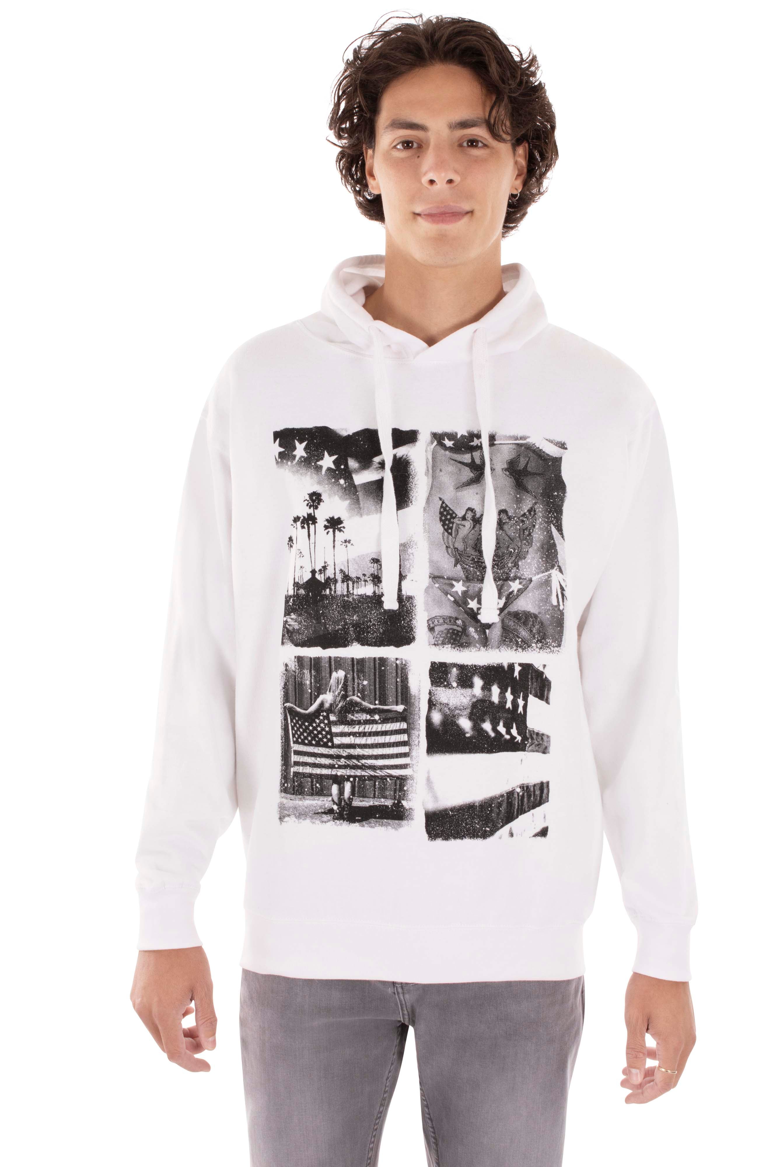 Chandail en coton ouaté avec imprimé graphique noir et blanc représentant quatre images dans lesquelles on peut apercevoir le drapeau des États-Unis. Capuchon ajustable sur lacets coulissants. Poignets et ourlet élastiques. Tissu moelleux, léger et confortable. Envers en douce matière ouatinée. Que ce soit pour le camping ou pour les fraîches soirées d’été, ce chandail pour homme est parfait pour allier confort et style !
