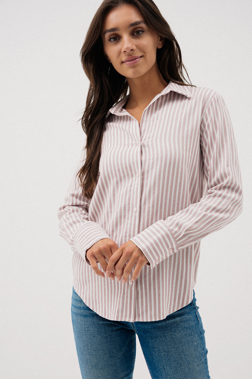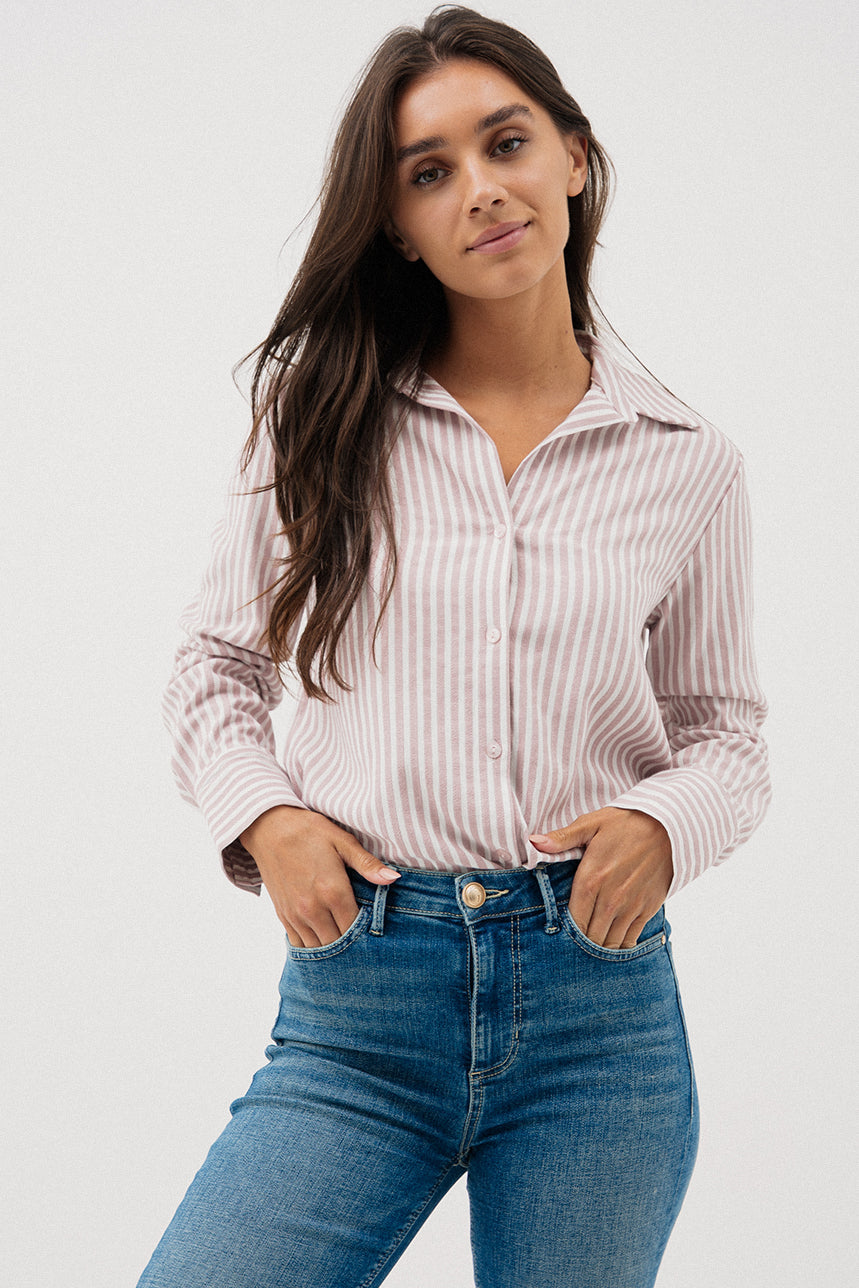 La blouse rayée rose et blanc adopte une coupe droite classique avec un col chemisier raffiné et une boutonnière pleine longueur, dont les boutons partent de la poitrine jusqu’à l’ourlet. Ses manches longues sont rehaussées d’une fente, de boutons et de plis délicats aux poignets pour une touche élégante. Son ourlet arrondi apporte une finition féminine et fluide, parfaite pour un style à la fois professionnel et décontracté.
