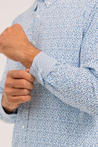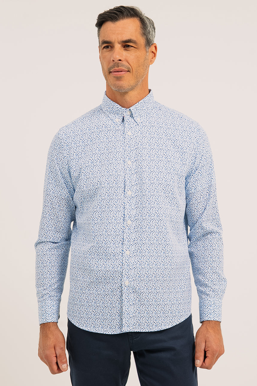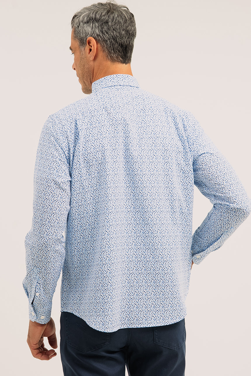 La chemise à petit motif bleuté présente une coupe régulière confortable, agrémentée de plis d’aisance dans le haut de l’empiècement du dos pour plus de liberté de mouvement. Elle est dotée d’un col américain classique et d’une boutonnière pleine longueur. Ses manches longues se terminent par des poignets biseautés à revers en tissu contrastant, fermés par des boutons, et l’ourlet arrondi apporte une finition élégante. Confectionnée dans un tissu hyper extensible, cette chemise est facile d’entretien et résiste au froissement, combinant style et praticité au quotidien.
