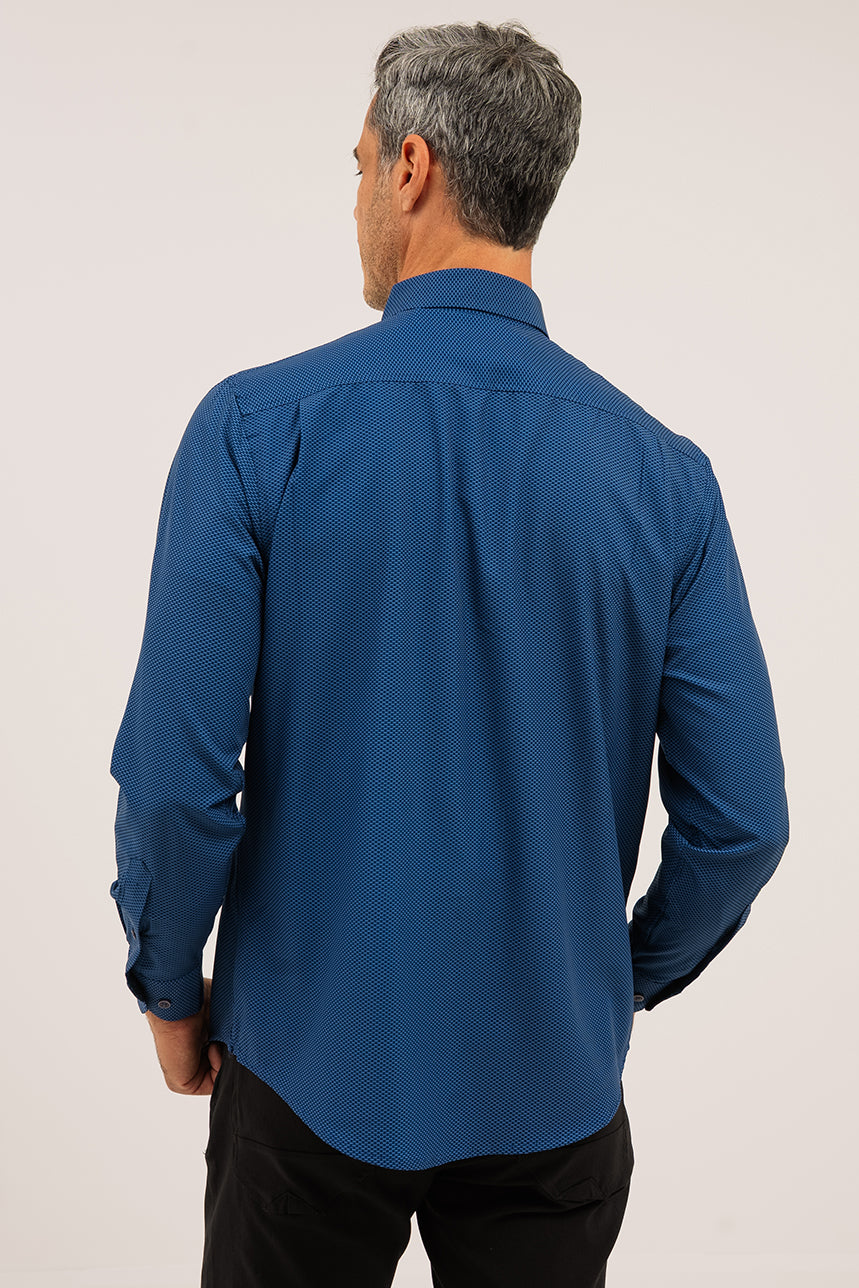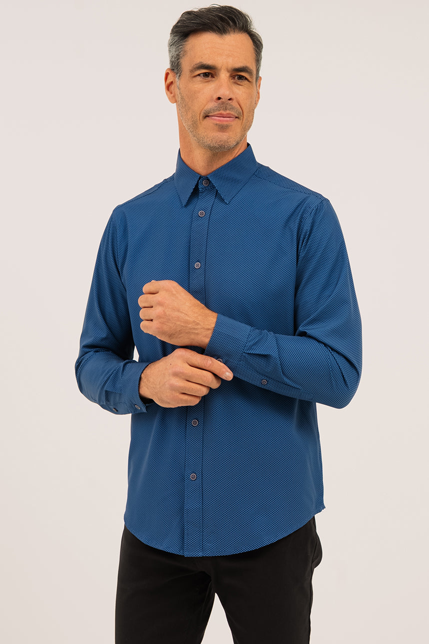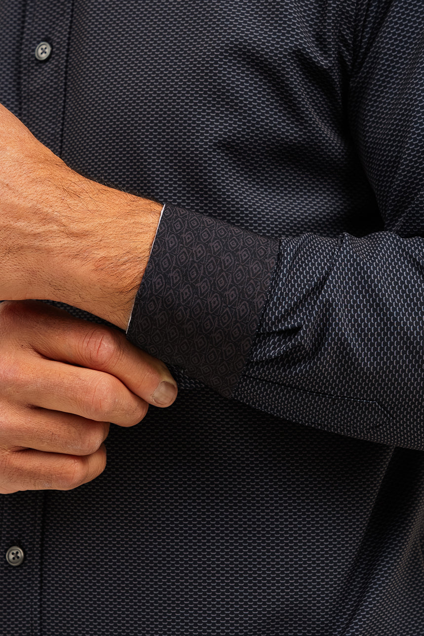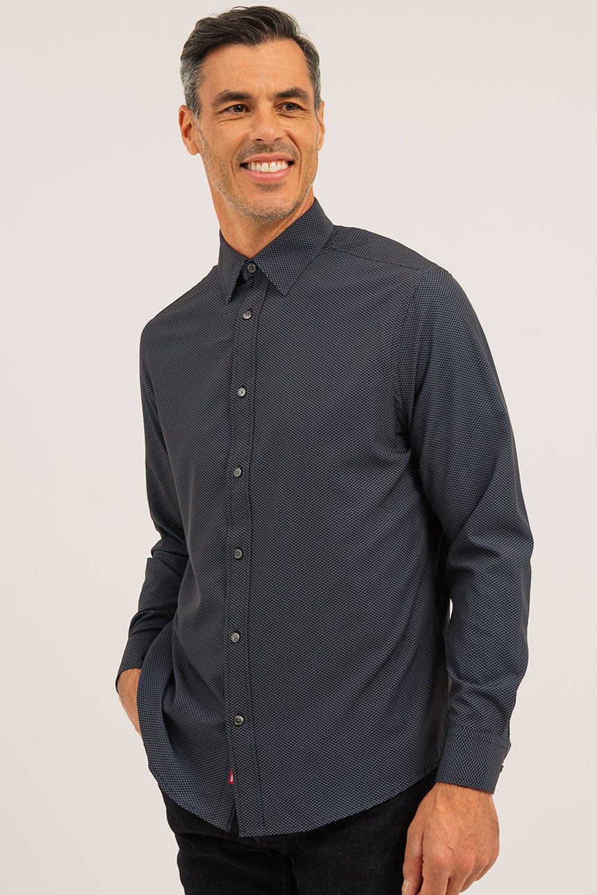 La chemise à petit motif ton sur ton présente une coupe régulière confortable, agrémentée de plis d’aisance au niveau de l’empiècement supérieur du dos pour une meilleure liberté de mouvement. Elle se distingue par un col italien élégant et une boutonnière pleine longueur. Ses manches longues se terminent par des poignets biseautés à revers avec un motif contrastant, fermés par des boutons. L’ourlet arrondi permet de la porter aussi bien rentrée que libre. Confectionnée dans un tissu hyper extensible, cette chemise est facile d’entretien et résiste au froissement, alliant praticité et style au quotidien.