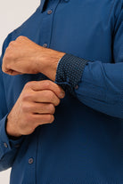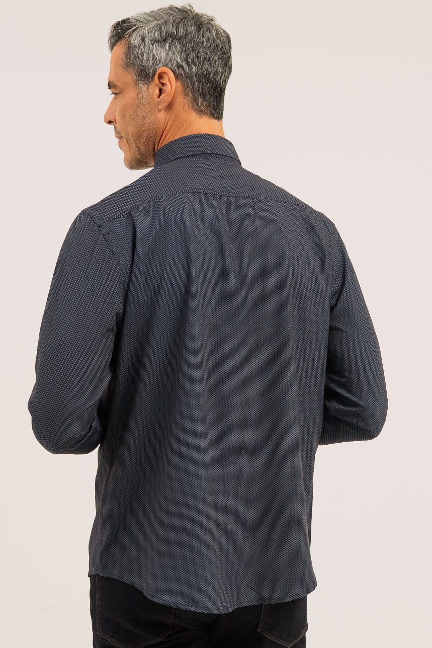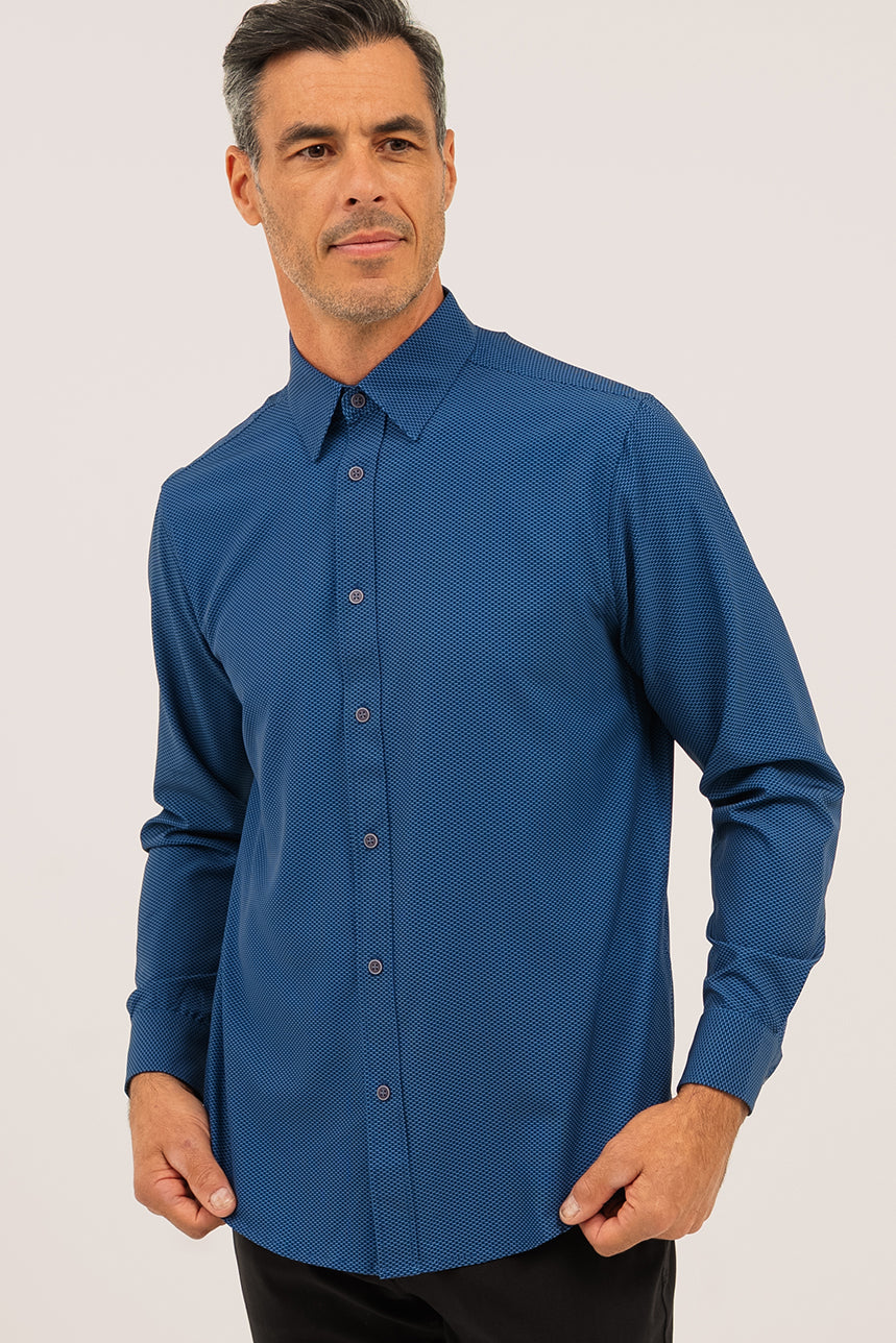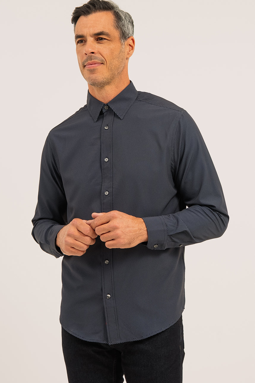La chemise à petit motif ton sur ton présente une coupe régulière confortable, agrémentée de plis d’aisance au niveau de l’empiècement supérieur du dos pour une meilleure liberté de mouvement. Elle se distingue par un col italien élégant et une boutonnière pleine longueur. Ses manches longues se terminent par des poignets biseautés à revers avec un motif contrastant, fermés par des boutons. L’ourlet arrondi permet de la porter aussi bien rentrée que libre. Confectionnée dans un tissu hyper extensible, cette chemise est facile d’entretien et résiste au froissement, alliant praticité et style au quotidien.