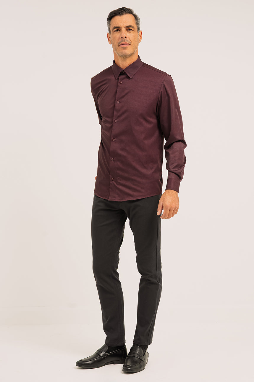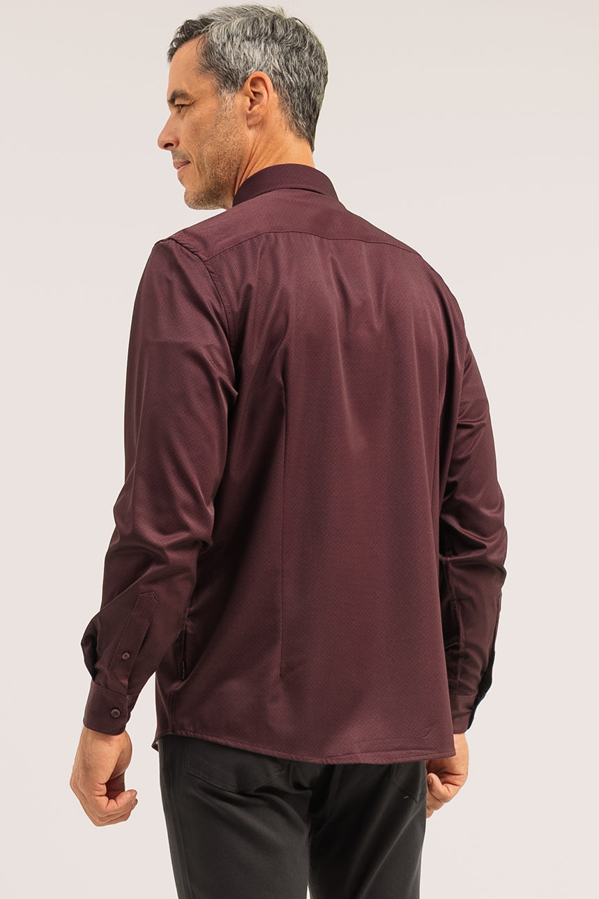 La chemise bordeaux imprimée à motif quadrillé offre une coupe ajustée qui suit naturellement la silhouette, soutenue par des pinces d’ajustement au dos pour une tenue nette et structurée. Elle est dotée d’un col italien classique et d’une boutonnière pleine longueur à l’avant. Les manches longues se terminent par des poignets biseautés à revers, soulignés d’une ligne contrastante et fermés par boutons pour un détail soigné. Son ourlet arrondi permet de la porter aussi bien rentrée dans le pantalon que laissée libre. Confectionnée dans un tissu extensible, elle offre confort et aisance au quotidien.