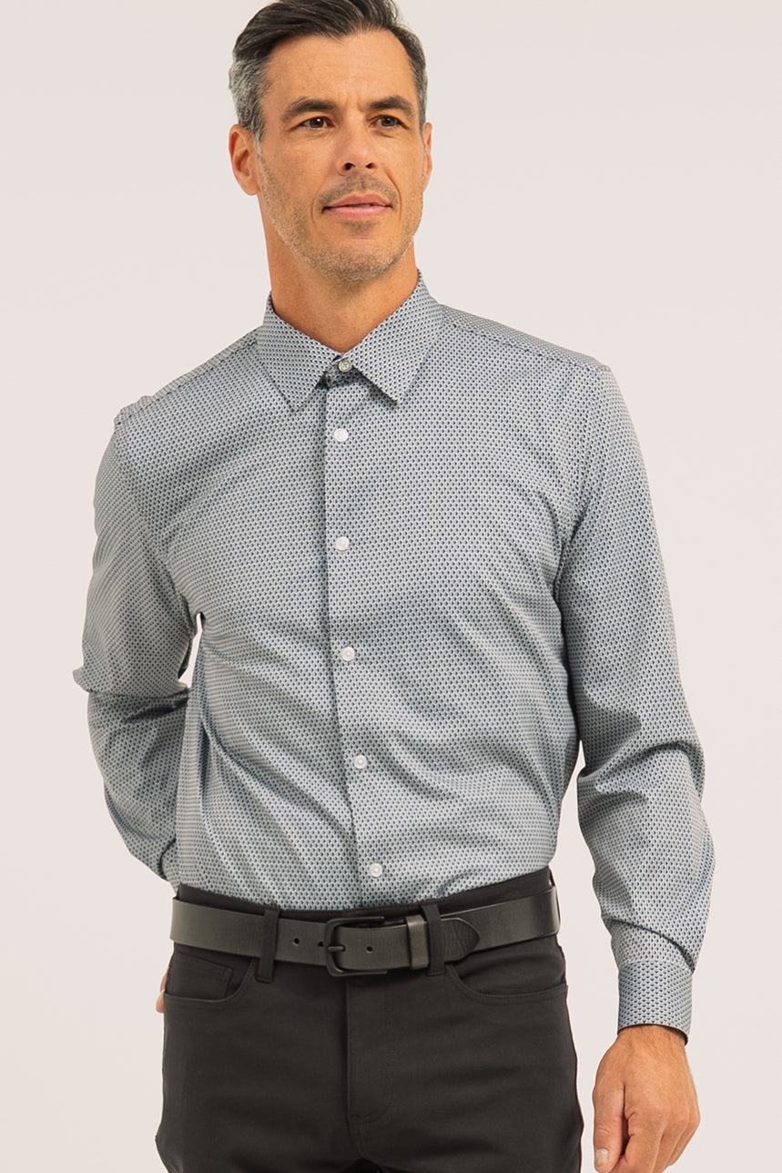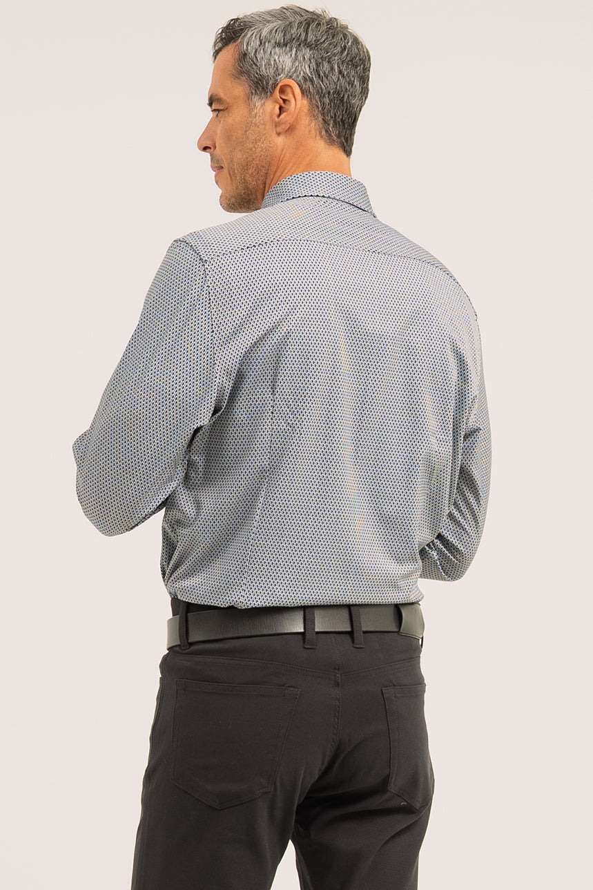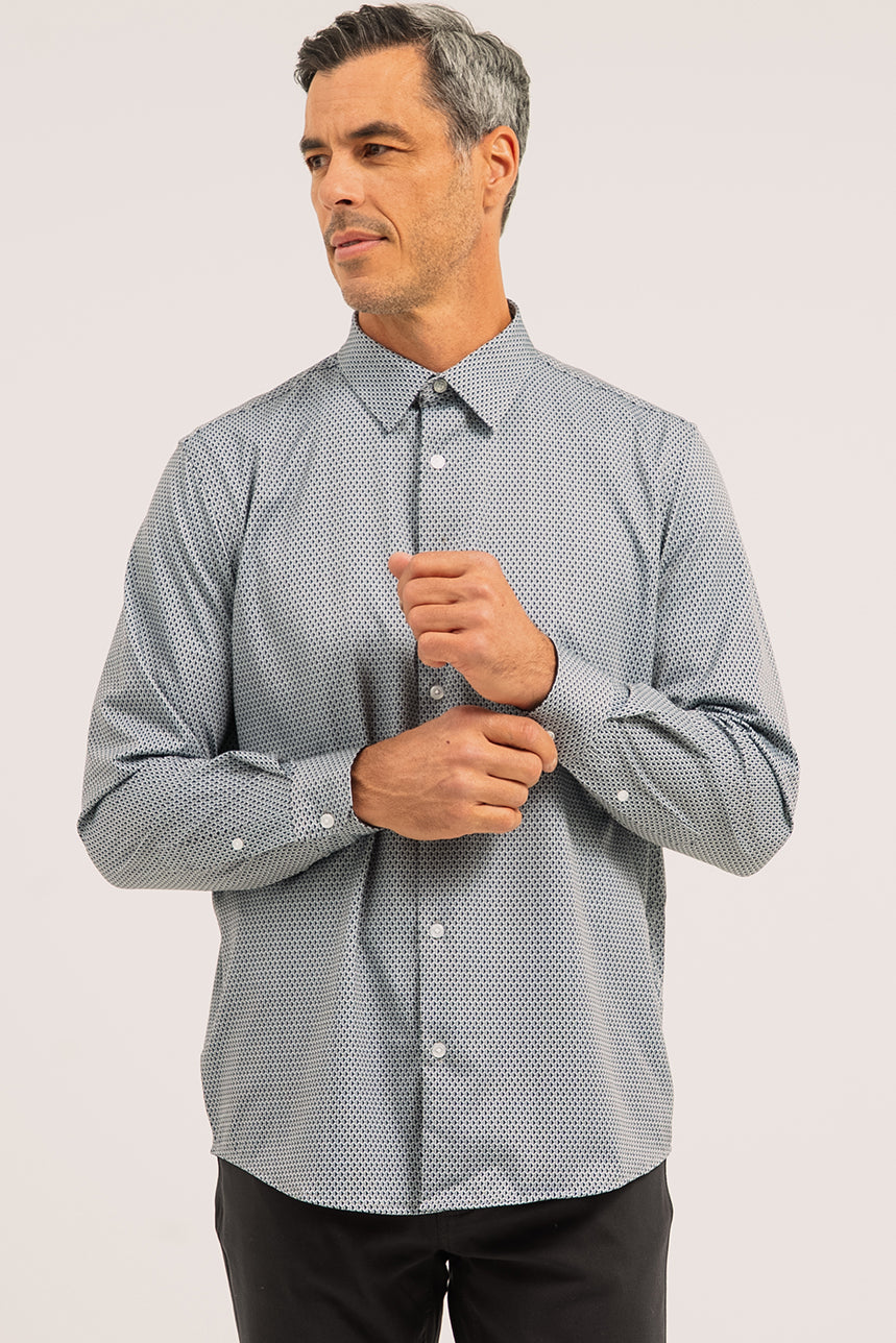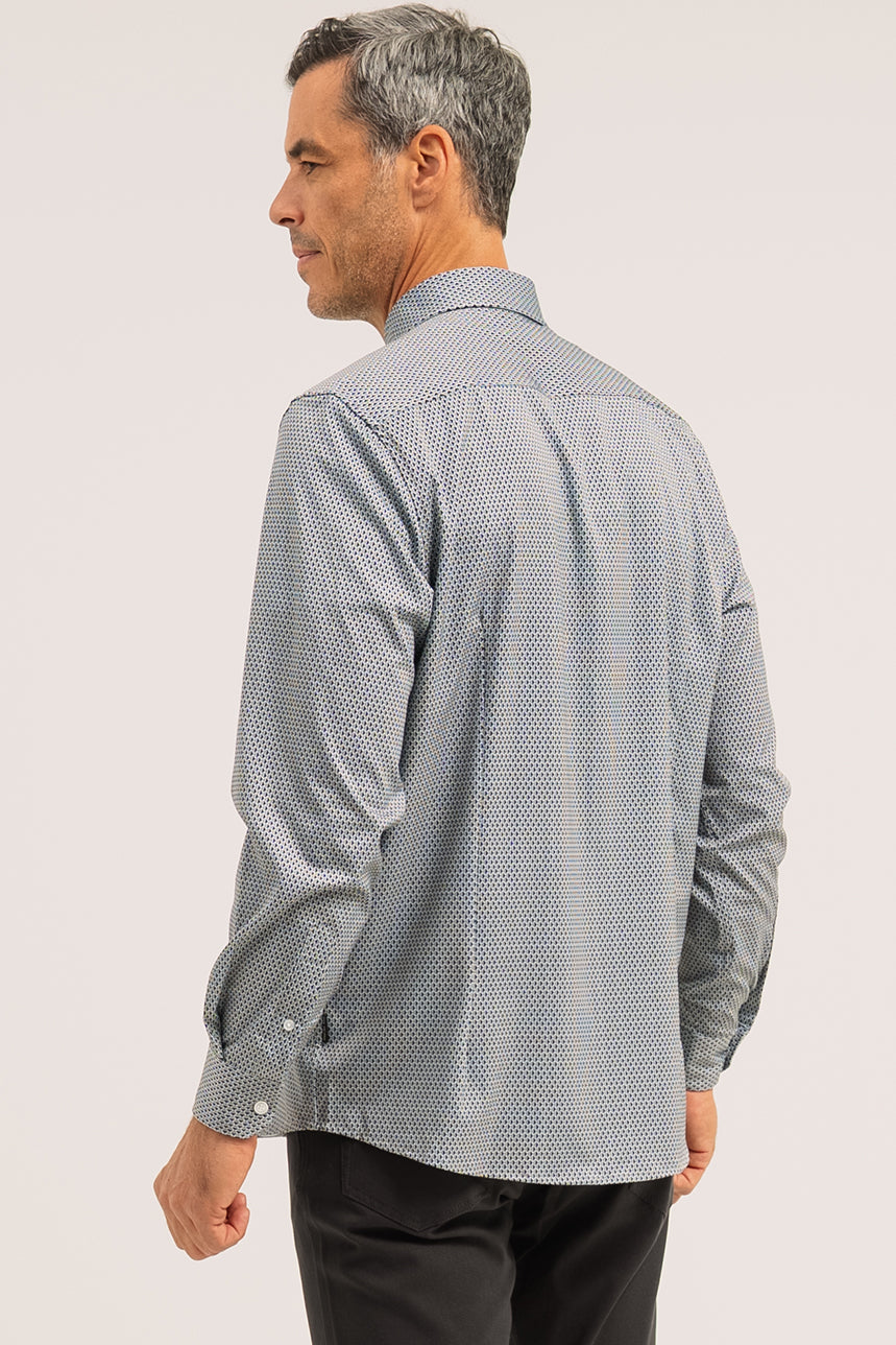 La chemise imprimée à motif géométrique présente une coupe ajustée qui met la silhouette en valeur, soutenue par des pinces d’ajustement au dos pour une finition soignée. Elle est dotée d’un col italien classique et d’une boutonnière pleine longueur à l’avant. Les manches longues se terminent par des poignets biseautés à revers, rehaussés d’une ligne contrastante, avec ouverture par boutons. L’ourlet arrondi permet de la porter rentrée ou non selon le style souhaité. Confectionnée dans un tissu extensible, elle assure confort et aisance tout au long de la journée.