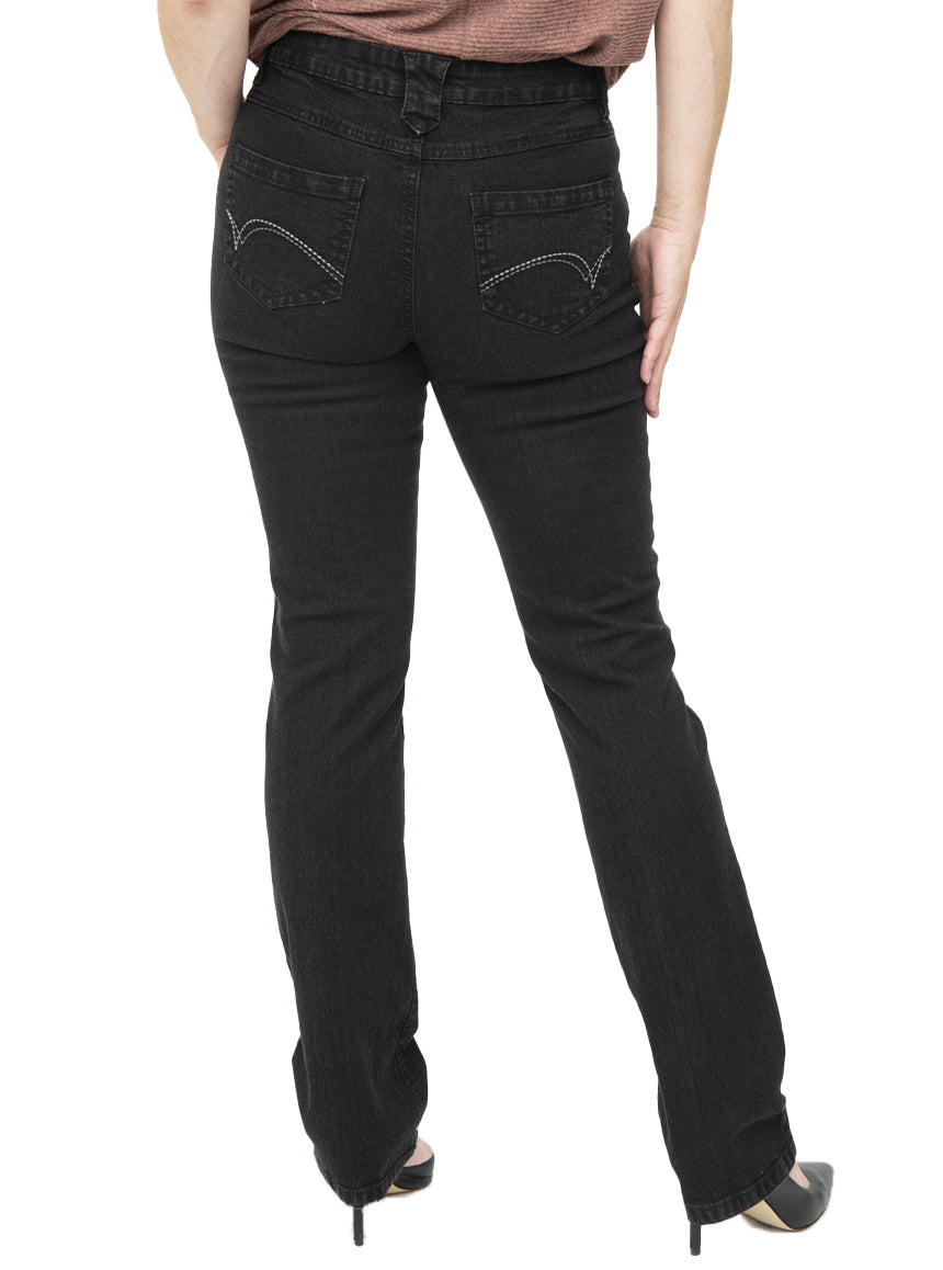 Coupe de jeans Pentagone à jambe droite. Le jeans noir idéal pour la femme qui désire un denim confortable tout en valorisant sa silhouette. S'agence très bien avec tous les hauts.
