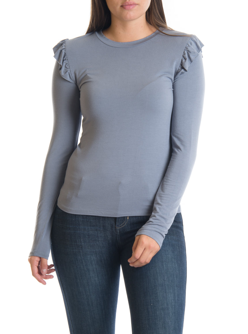 T-shirt léger Pentagone à manches longues et volants aux épaules. Tissu doux et confortable. Les volants apporte une belle touche de féminité à ce haut. Il s'agence très bien à une jupe, un pantalon ou un jeans.