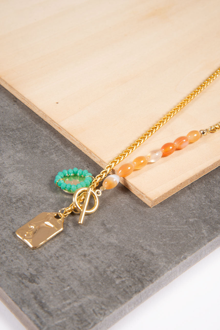 Collier chaîne avec breloque représentant un visage abstrait. Billes colorées. Fermoir à traverse à l'avant. Longueur : 28 cm.