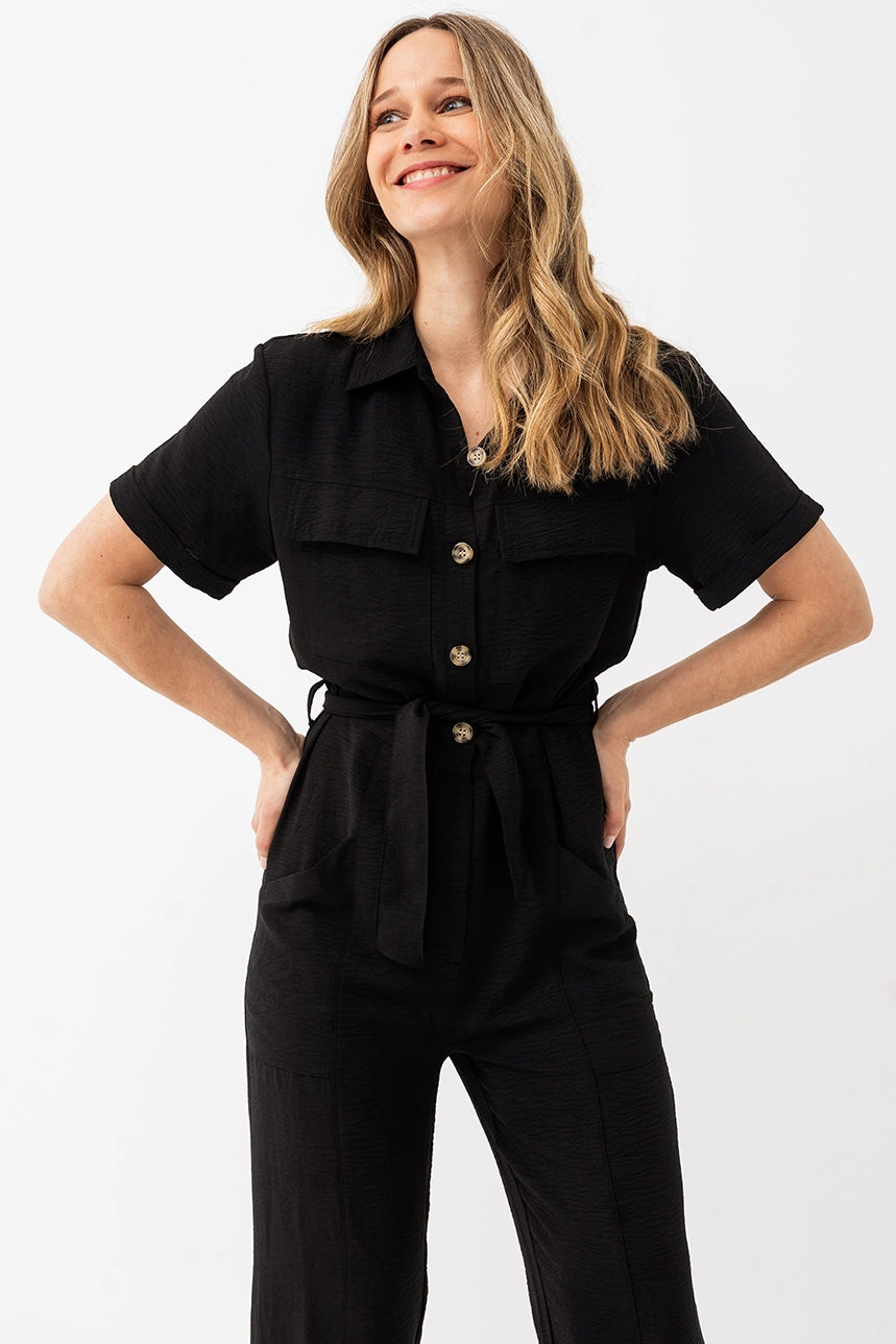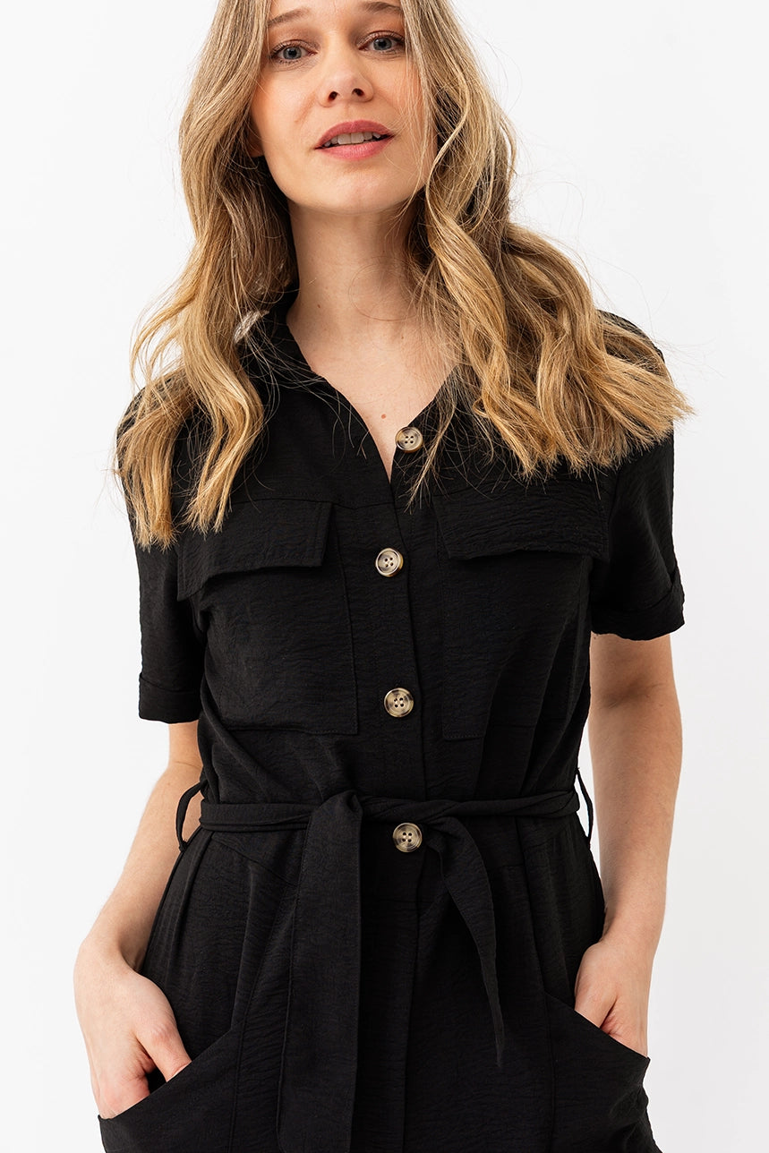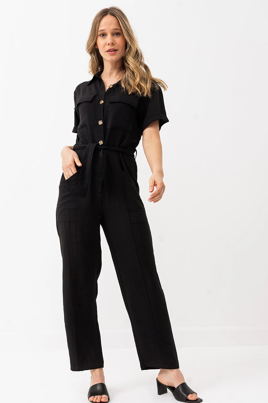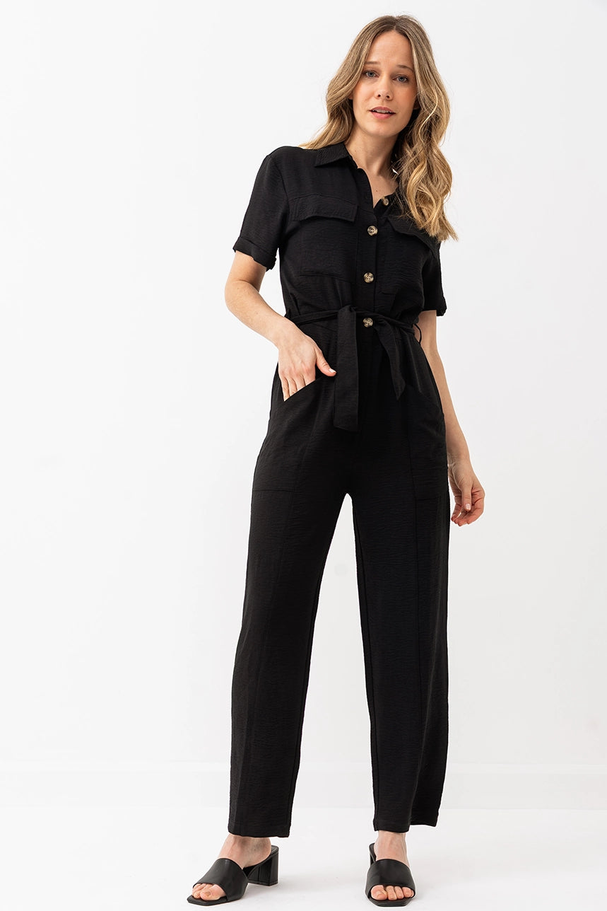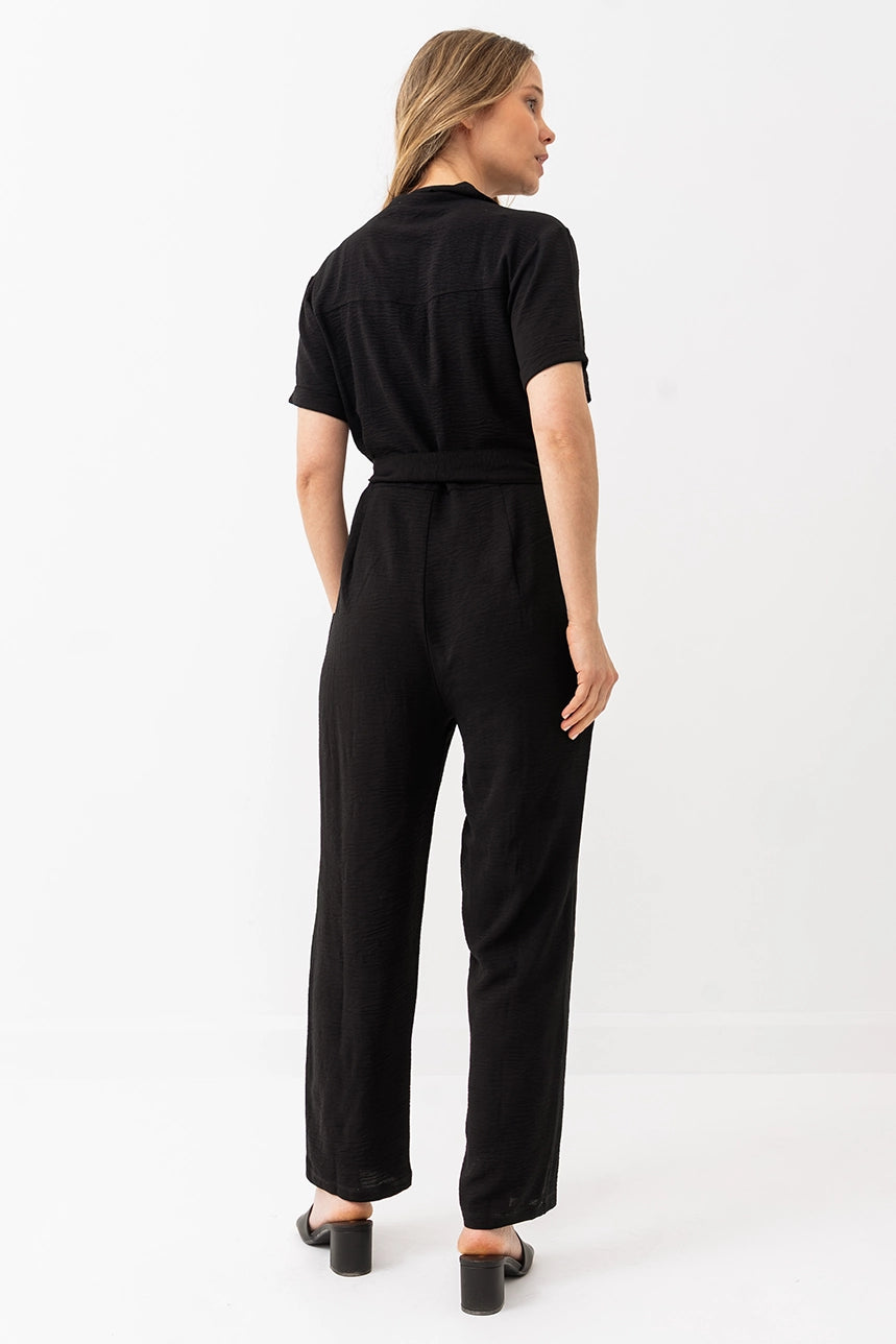 Cette combinaison au tombé fluide se distingue par sa coupe ample, son col chemisier et sa ceinture à nouer qui structure la taille. Dotée de poches pratiques et d’une fermeture à l’avant, elle est à la fois stylée et confortable grâce à sa matière extensible au fini froissé.