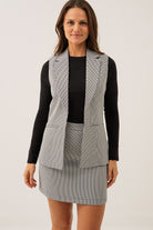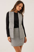 La veste habillée pied de poule noire présente une coupe près du corps qui met en valeur la silhouette. Elle est dotée d’un col cranté élégant et de deux poches passepoilées à l’avant, tandis que son ourlet droit et sa longueur sous la taille lui confèrent un style soigné et structuré. Conçue pour se porter ouverte, cette veste combine sophistication et confort pour un look chic et moderne.