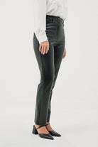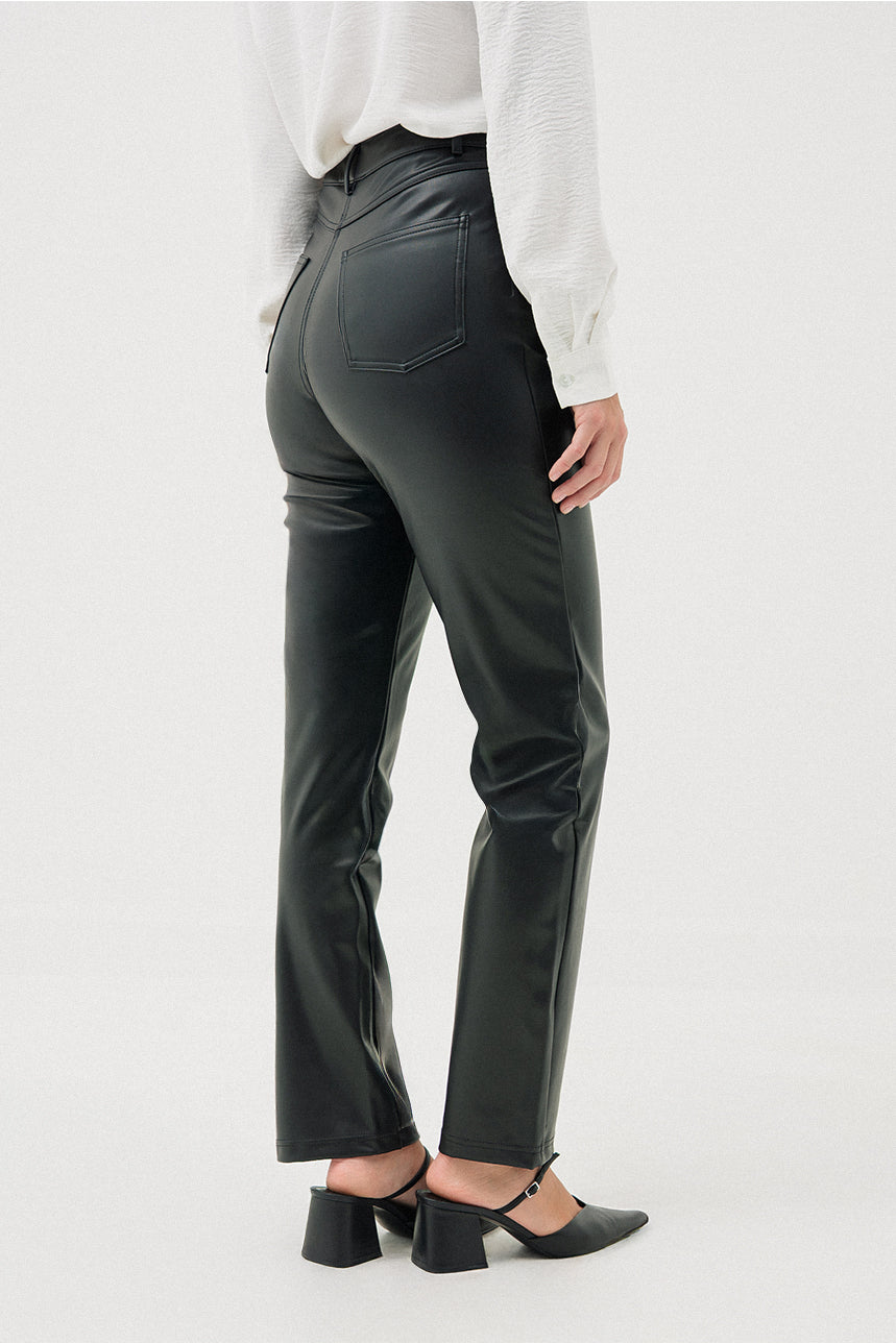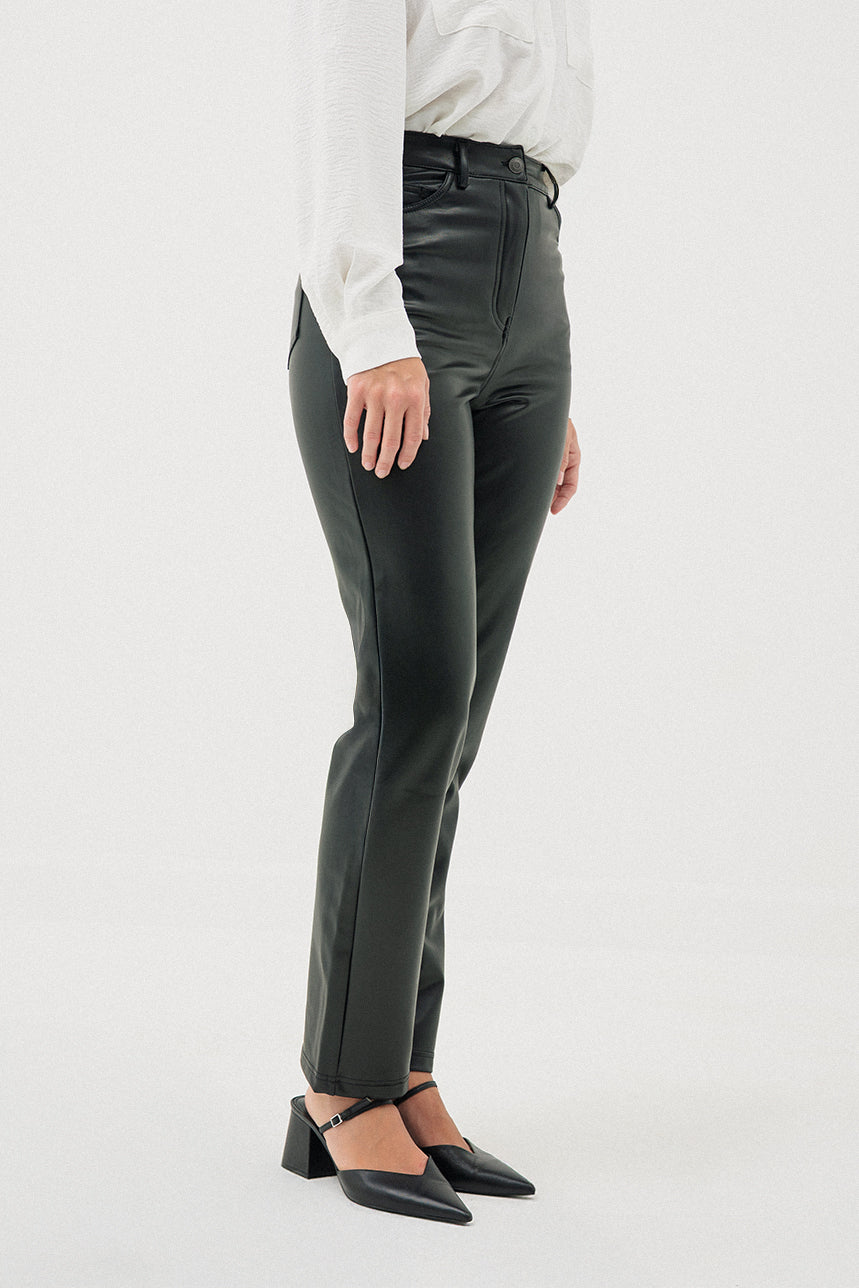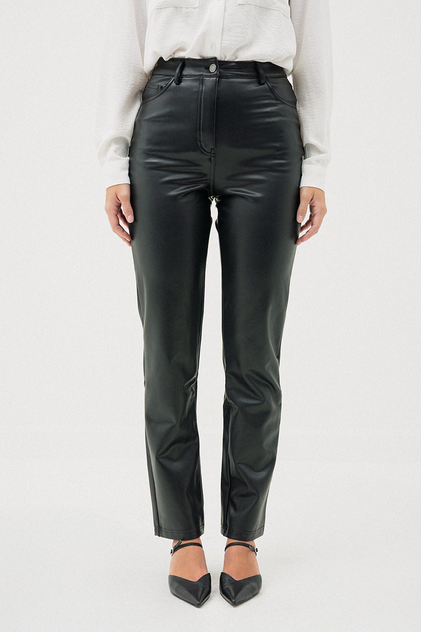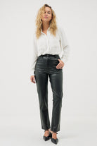 Le pantalon en faux-cuir noir présente une taille haute et une coupe droite qui allonge la jambe et crée une silhouette moderne. Il est conçu dans un style 5 poches classique avec une fermeture éclair et bouton à l’avant, ainsi que 5 passants de ceinture pour permettre différents styles d’ajustement. Son fini cuir donne un look chic et audacieux, parfait pour rehausser une tenue du quotidien ou pour un ensemble plus habillé.