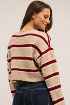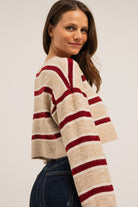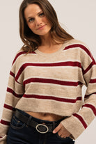 Le chandail en tricot léger beige et bourgogne se distingue par sa coupe boxy courte qui apporte une touche moderne et décontractée. Il arbore un col bateau élégant et des finitions côtelées aux poignets et à l’ourlet pour un rendu soigné. Ses manches longues tombantes assurent confort et aisance, tandis que sa matière douce et confortable offre une sensation agréable au porté.