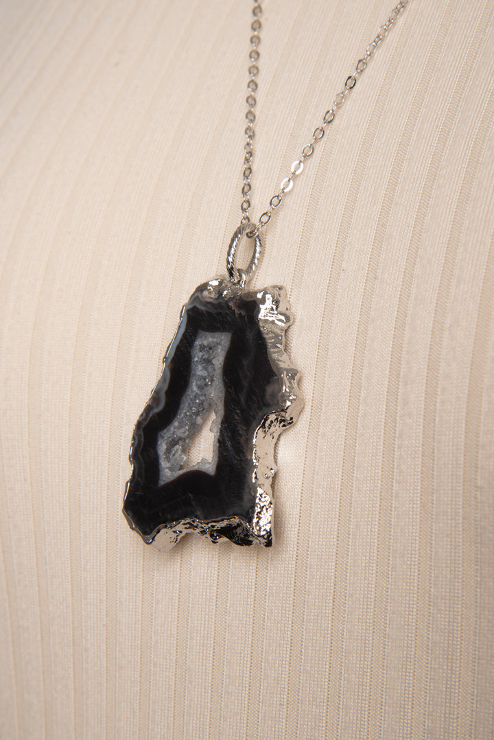 Collier chaîne pour femme avec breloque représentant une tranche de pierre précieuse. Ajustable sur attache chaînette et mousqueton. Longueur : 33 cm.