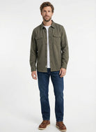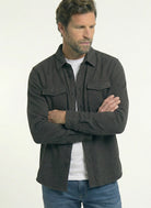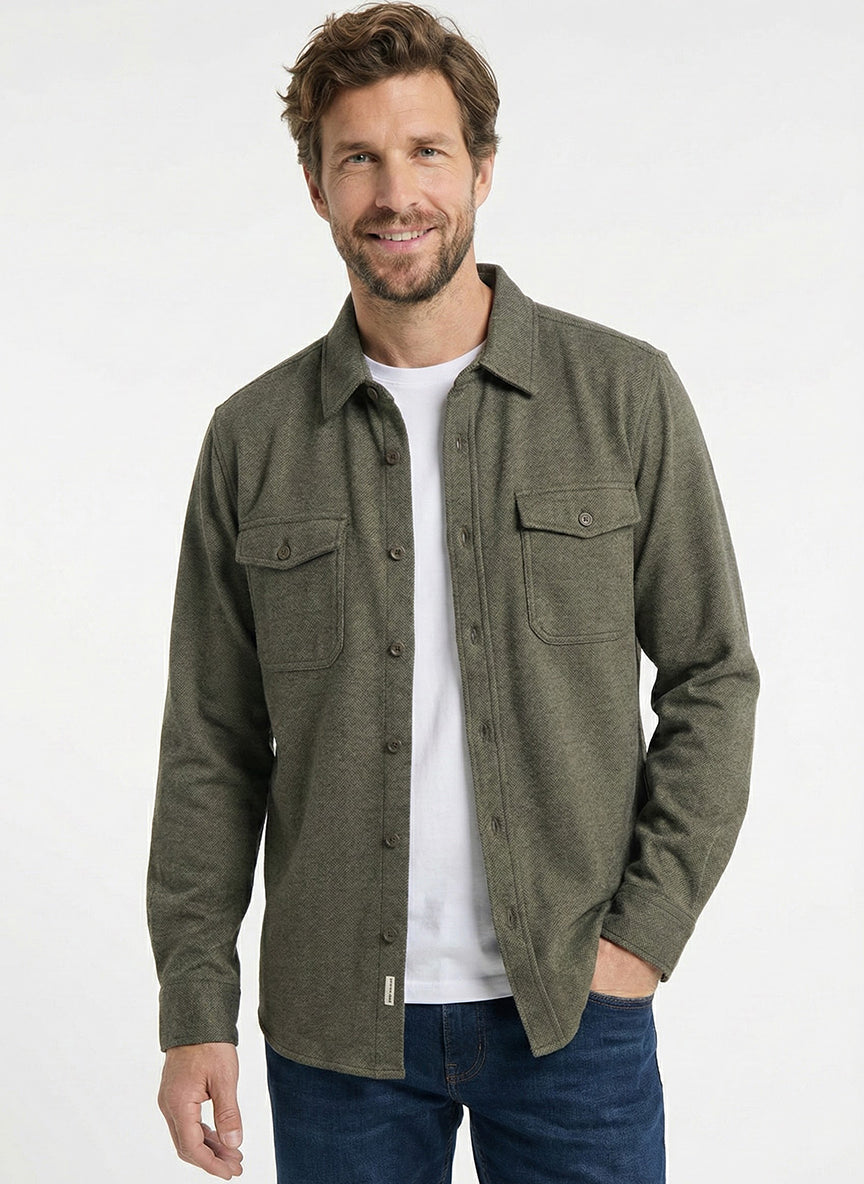 La chemise en tricot jersey à texture flanelle grise présente une coupe droite offrant un tombé naturel et confortable. Elle est dotée d’un col chemisier classique et d’une boutonnière pleine longueur pour un style polyvalent. Les manches longues se terminent par des poignets à revers en tissu contrastant avec ouverture boutonnée, ajoutant une touche raffinée. Deux poches appliquées à rabat à la poitrine apportent une allure utilitaire. L’ourlet légèrement arrondi et la petite étiquette à la couture latérale gauche, placée à 2 pouces de l’ourlet, complètent les détails soignés. Confectionnée dans un tissu doux et extensible, cette chemise combine confort et élégance décontractée.