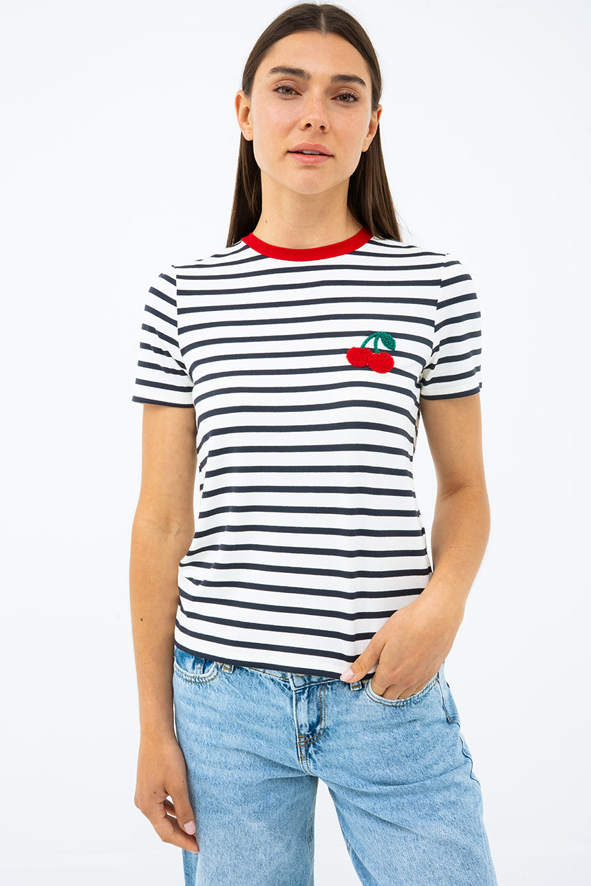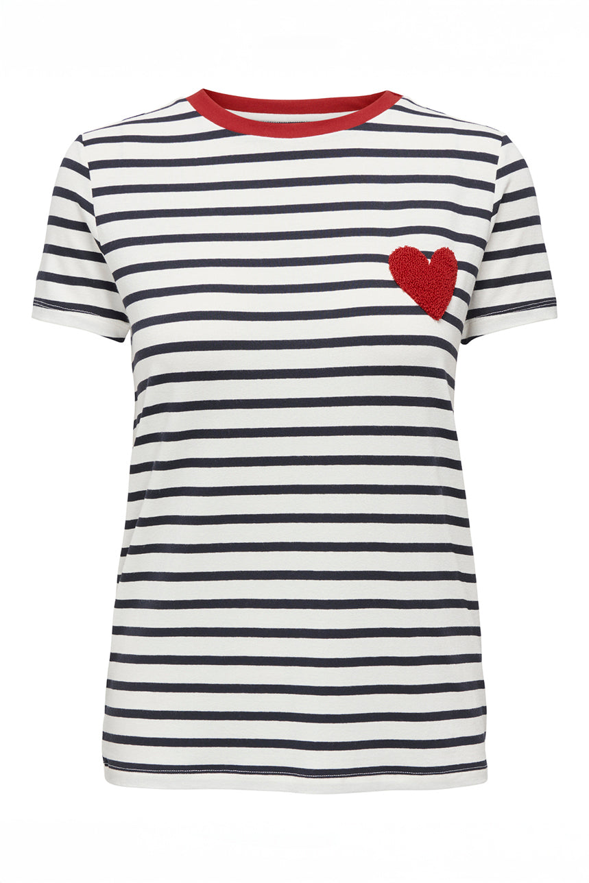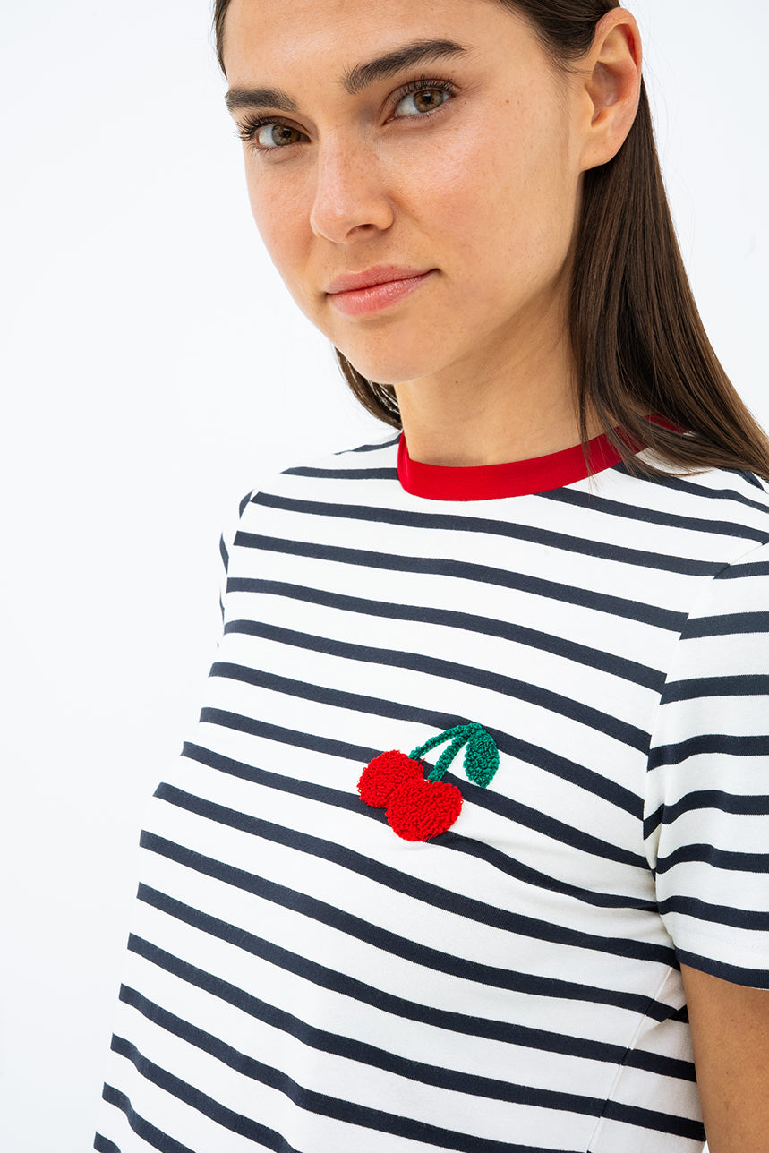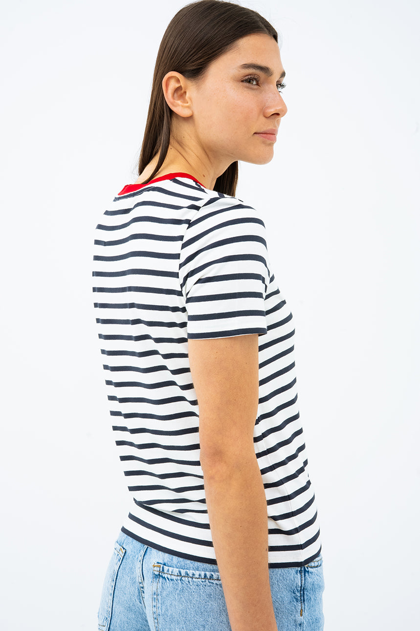 À la fois ludique et délicat, le t-shirt rayé avec broderie à la poitrine apporte une touche de fraîcheur à votre garde-robe. Sa coupe droite offre un tombé naturel, tandis que le col rond de couleur accentuée ajoute une note contrastée et dynamique. Les manches courtes et la broderie délicate à l’emplacement d’une poche poitrine rehaussent ce basique d’un charme discret. Confectionné dans une matière très douce et fluide, il assure un confort absolu au quotidien.