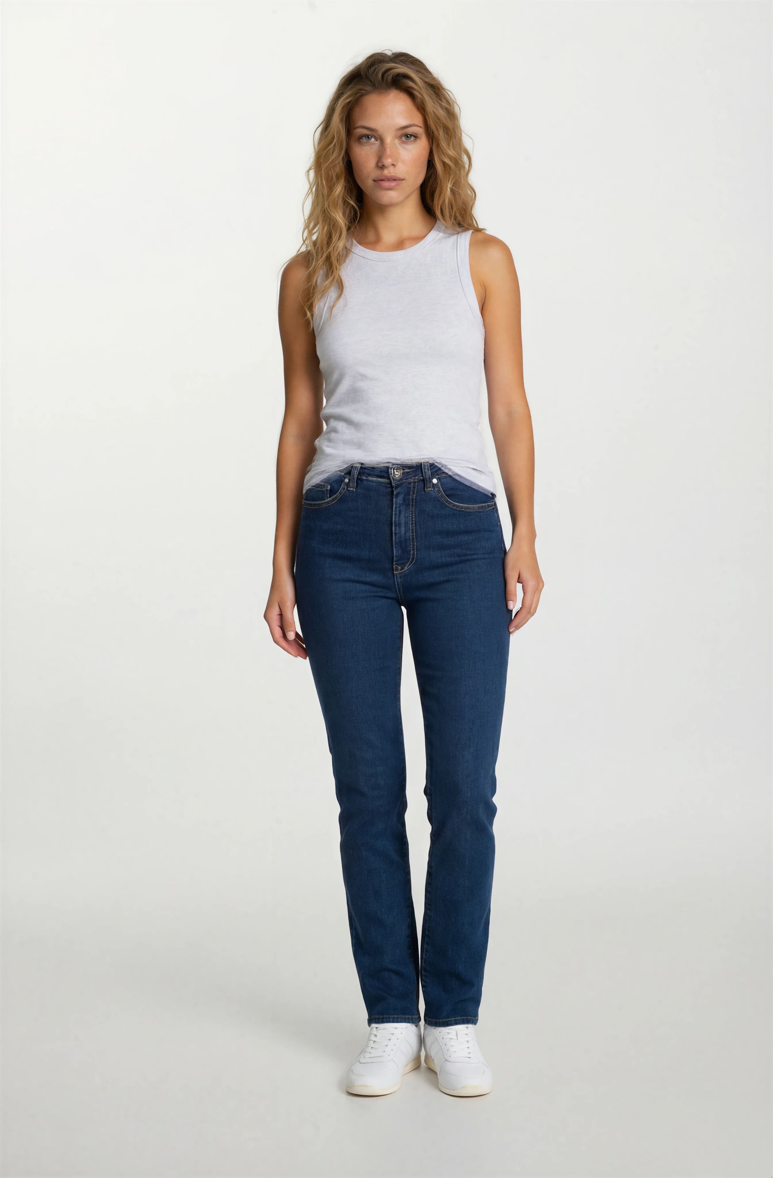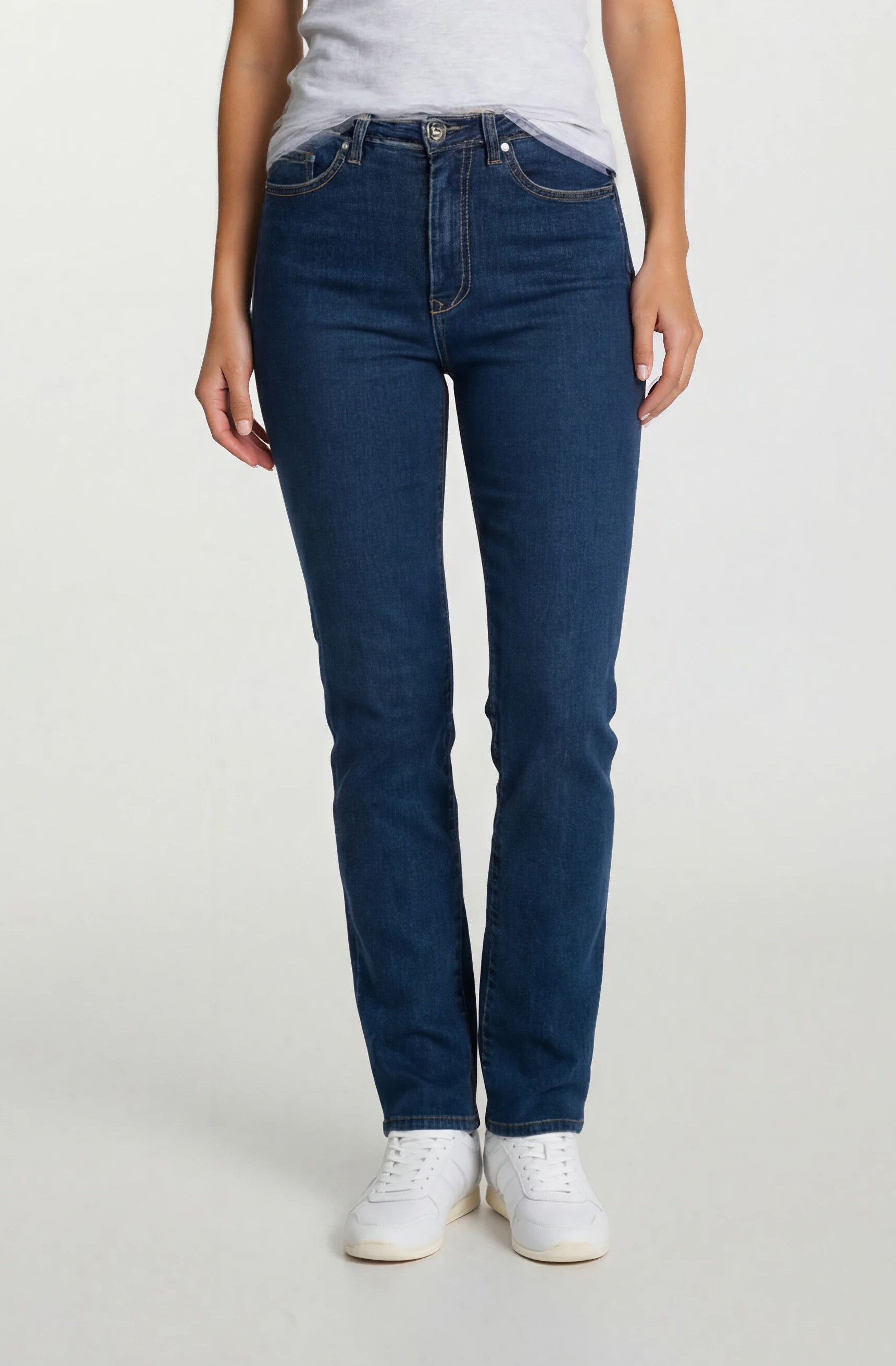 Coupe de jeans Pentagone à jambe droite et à taille haute. Le jeans bleu jeans idéal pour la femme qui désire un denim confortable tout en valorisant sa silhouette. S'agence très bien avec tous les hauts.