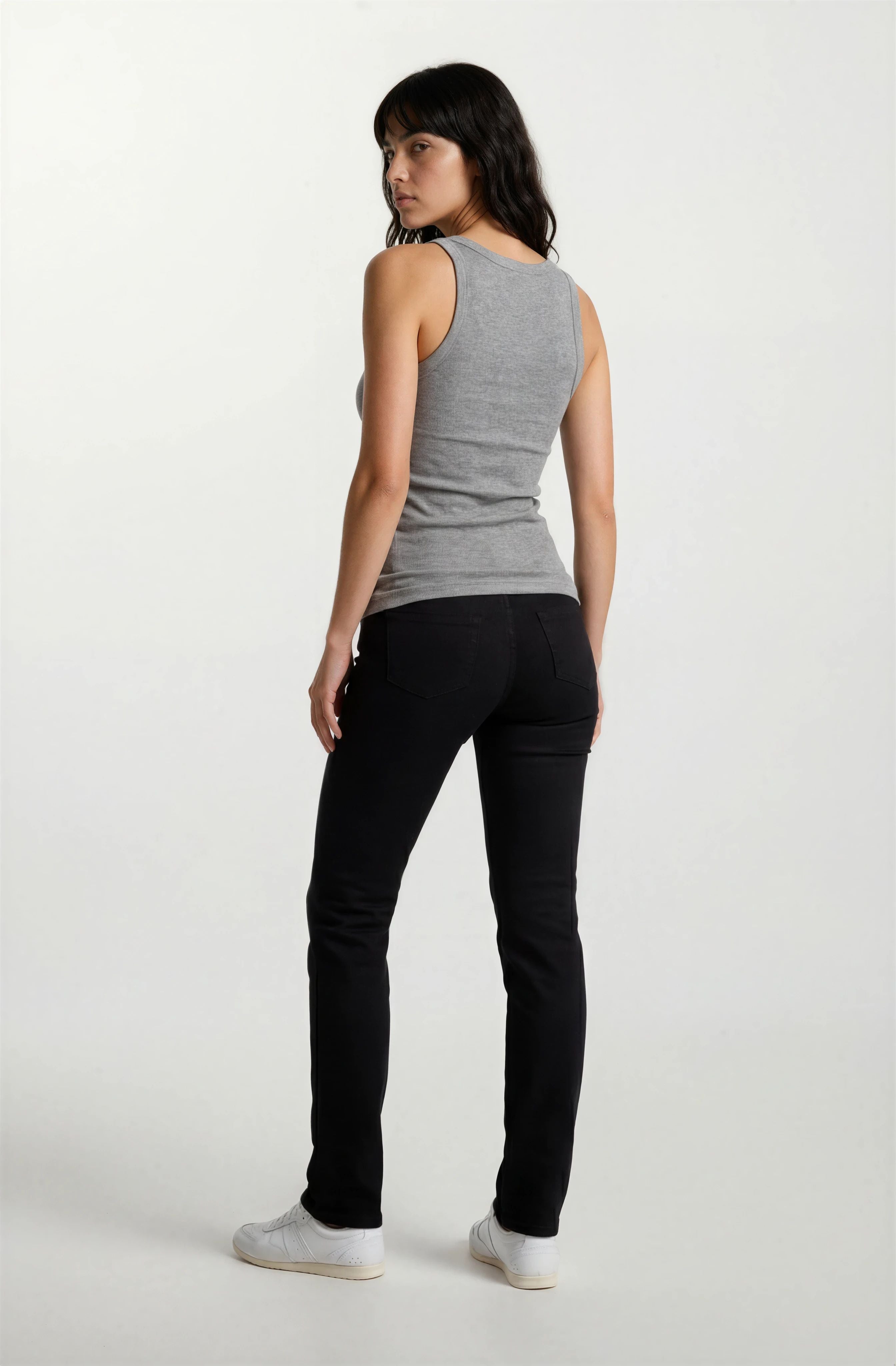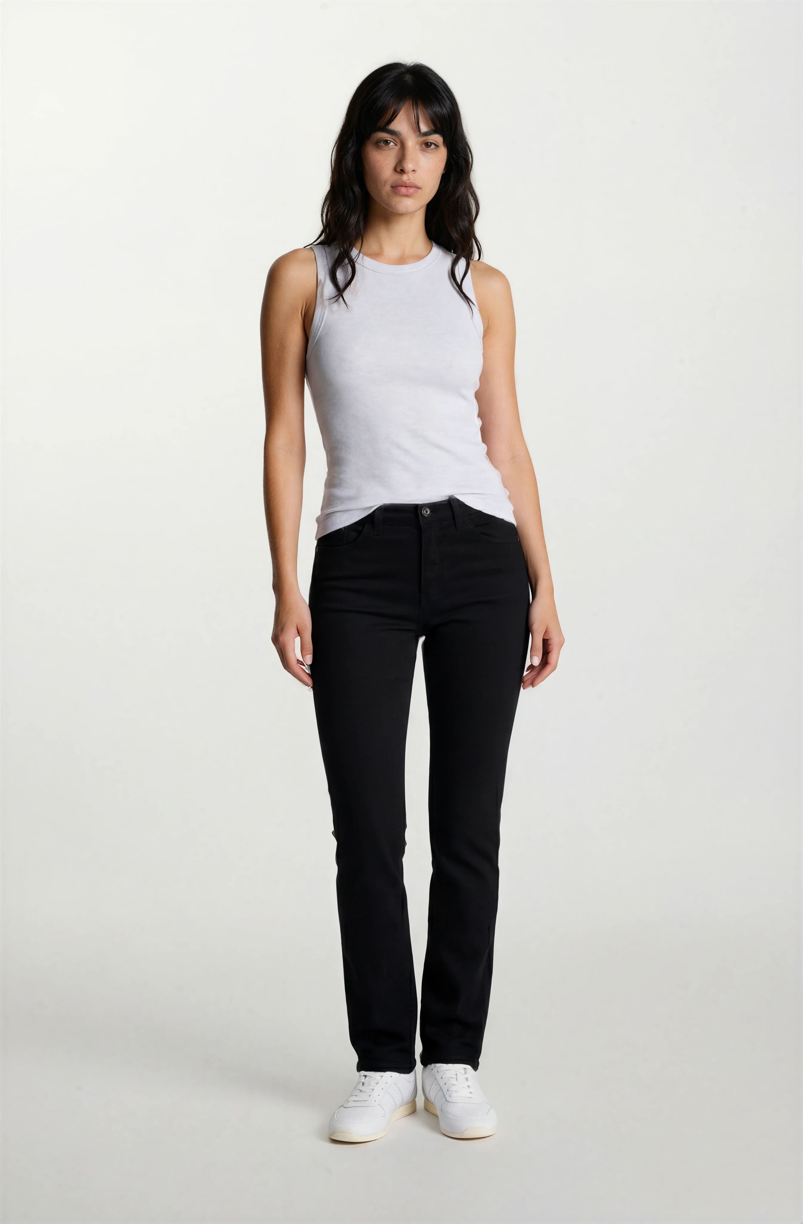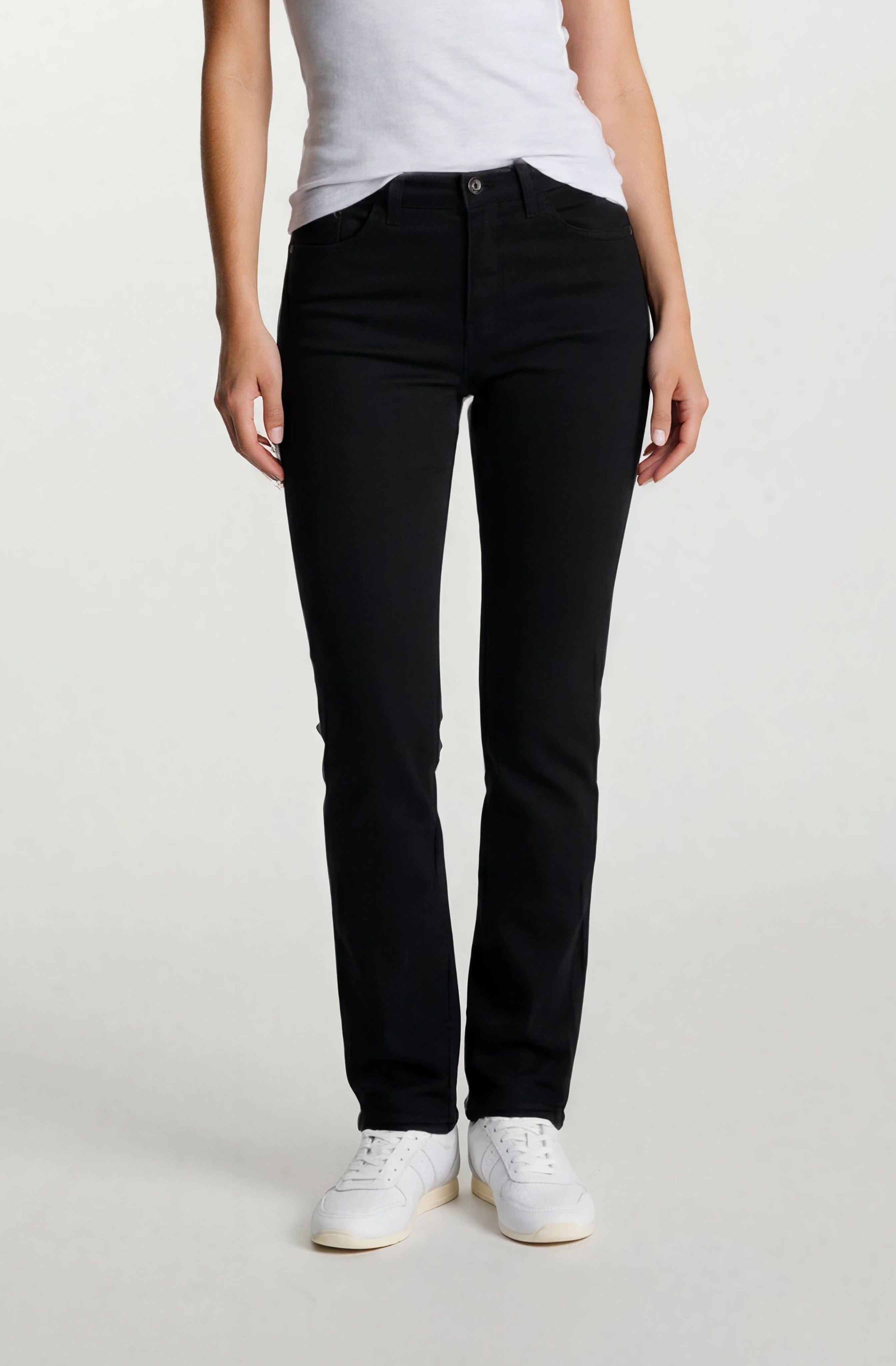 Coupe de jeans Pentagone à jambe droite. Le jeans noir idéal pour la femme qui désire un denim confortable tout en valorisant sa silhouette. S'agence très bien avec tous les hauts.