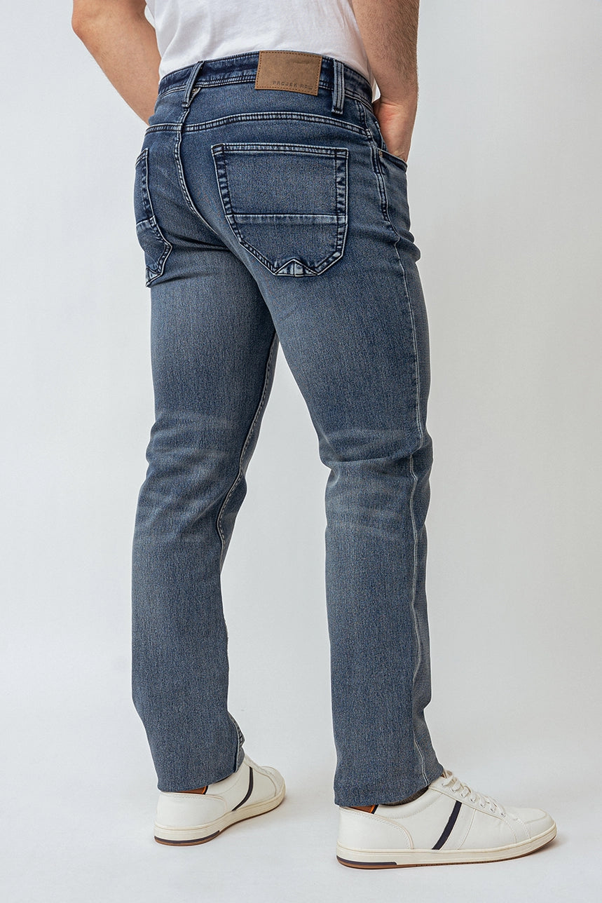 Adoptez un style décontracté avec le jeans droit délavé | Modèle Baru. Sa taille régulière, sa jambe droite et son denim délavé extensible offrent un ajustement confortable et un look intemporel. La bande de taille élastique assure un maintien optimal, parfait pour un confort au quotidien.