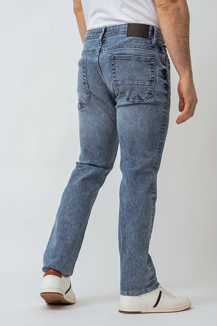 Adoptez un style décontracté avec le jeans droit délavé | Modèle Baru. Sa taille régulière, sa jambe droite et son denim délavé extensible offrent un ajustement confortable et un look intemporel. La bande de taille élastique assure un maintien optimal, parfait pour un confort au quotidien.