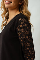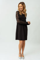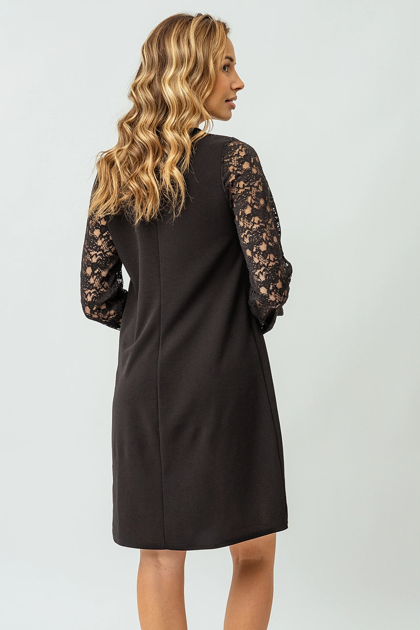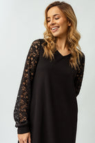 Élégante et intemporelle, cette robe noire avec manches en dentelle est parfaite pour vos occasions spéciales. Sa coupe régulière et son col en V mettent en valeur la silhouette avec raffinement. Doublée de dentelle délicate et ornée de manches longues transparentes, cette robe allie féminité et sophistication. Confectionnée dans une matière extensible et confortable, elle garantit un style impeccable tout en restant agréable à porter.