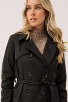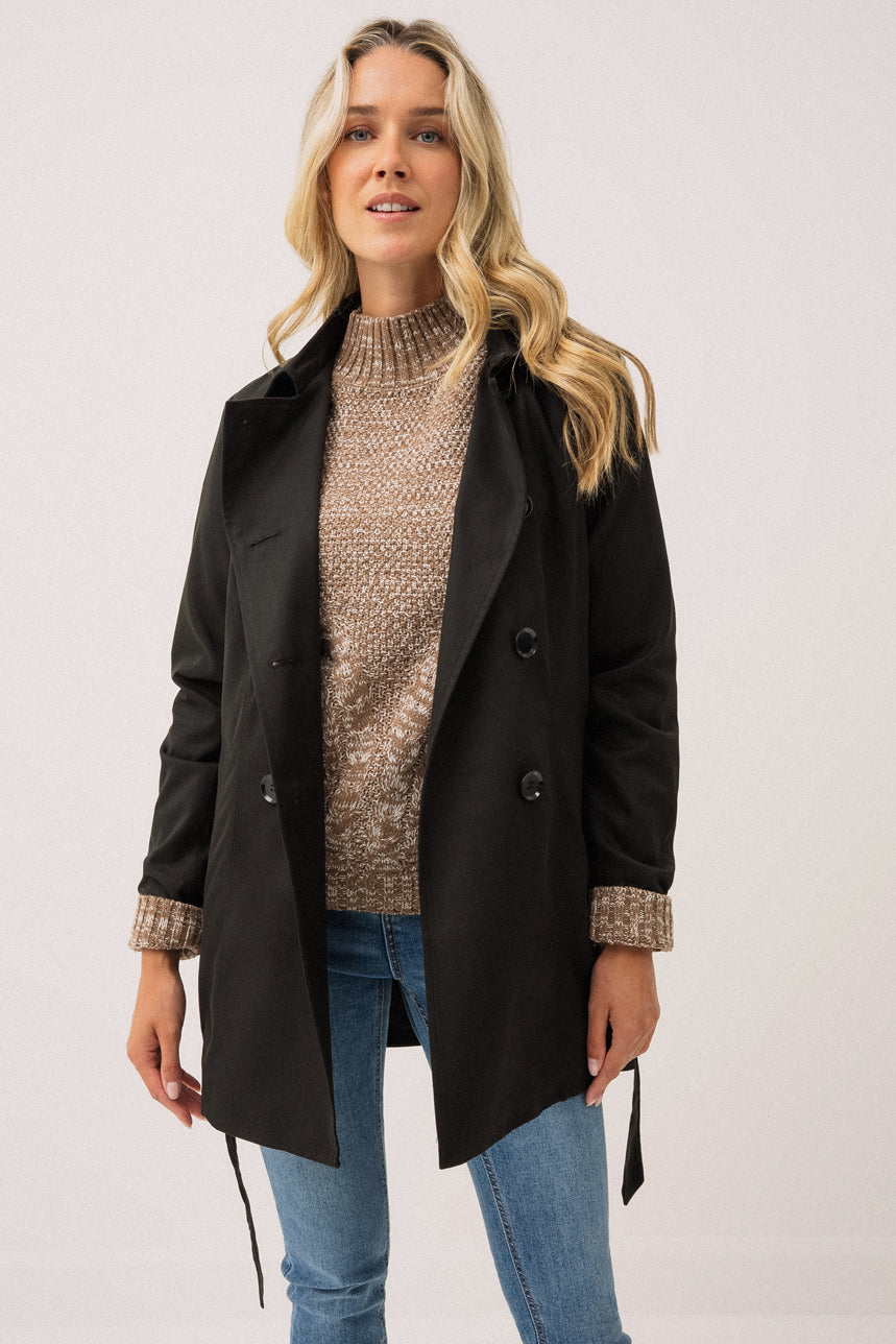 Classique et structuré, ce trench-coat noir revisité propose une silhouette ligne A élégante, idéale pour les superpositions de mi-saison. Doté d’un col Napoléon distinctif et de manches longues régulières, il offre une allure intemporelle. Les pincettes à l’avant et au dos soulignent la forme, tandis que les poches Welt en angle ajoutent une touche fonctionnelle et raffinée.