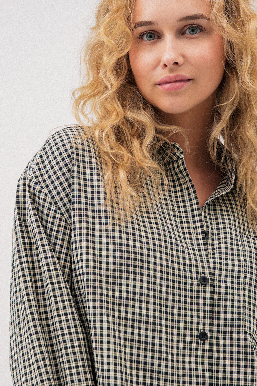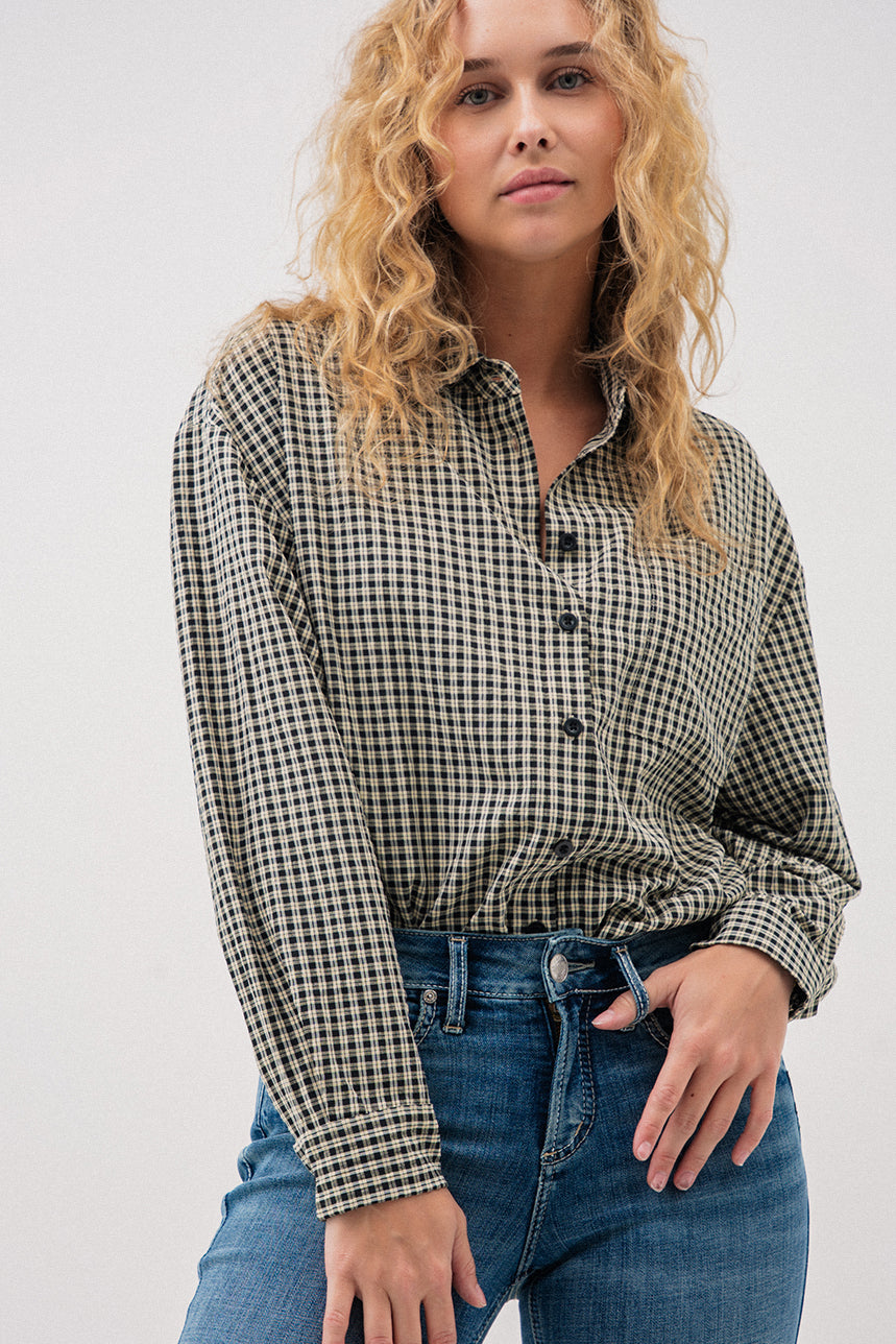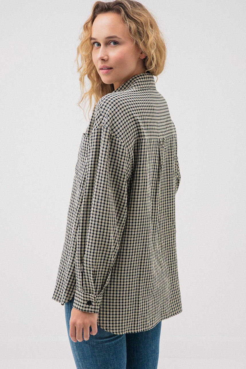 La blouse ample à carreaux se distingue par sa coupe décontractée et élégante, idéale pour un style casual-chic. Elle présente un col chemisier classique et une boutonnière pleine longueur à l’avant, tandis que ses manches longues se terminent par des poignets roulés une fois avec fente et bouton. Au dos, un pli creux central est rehaussé d’une boucle de suspension décorative, ajoutant une touche originale. Son ourlet droit est fendu sur les côtés, offrant confort et aisance de mouvement, parfait pour être portée seule ou superposée.