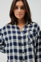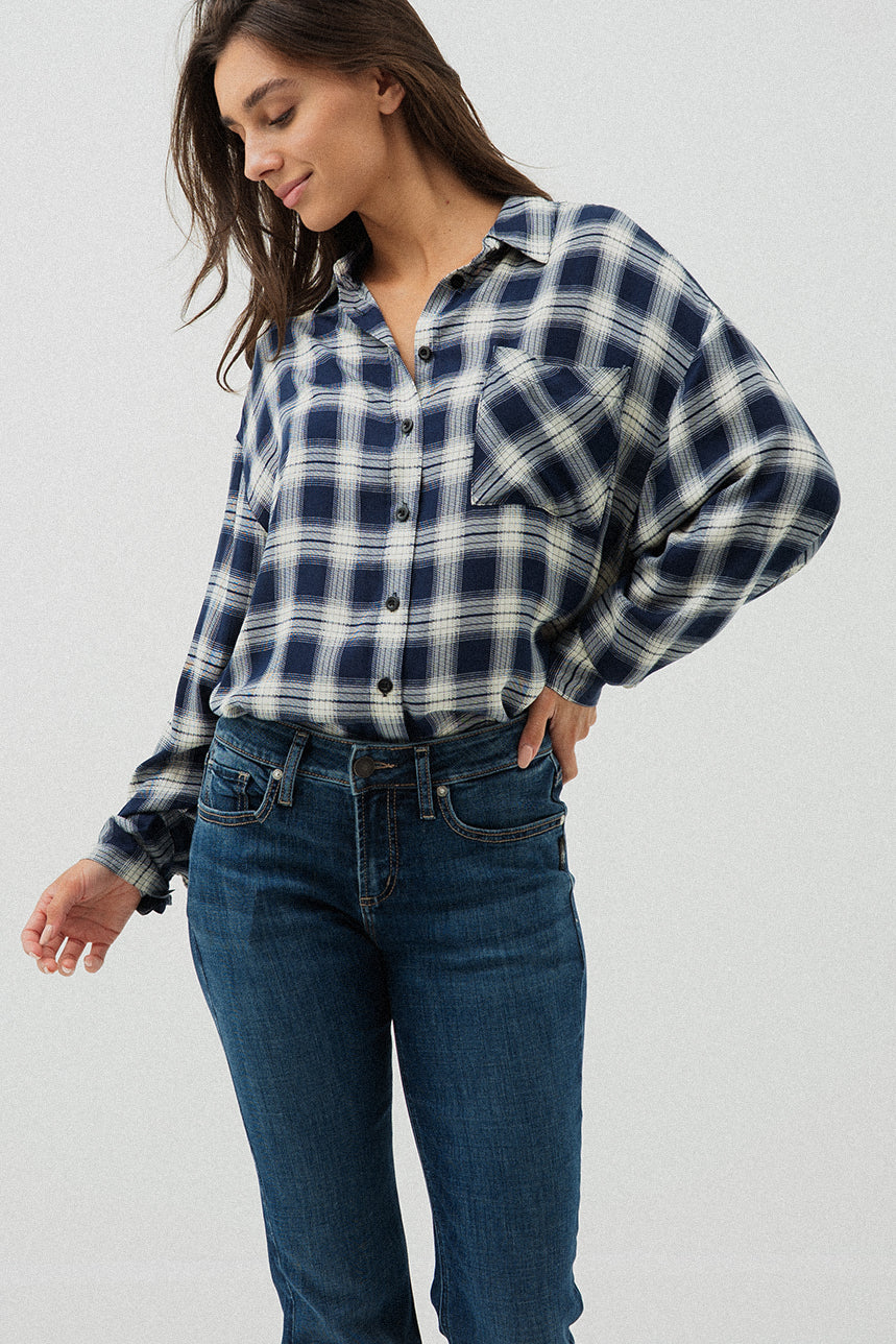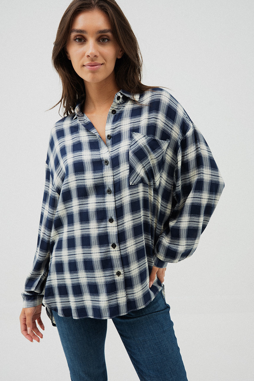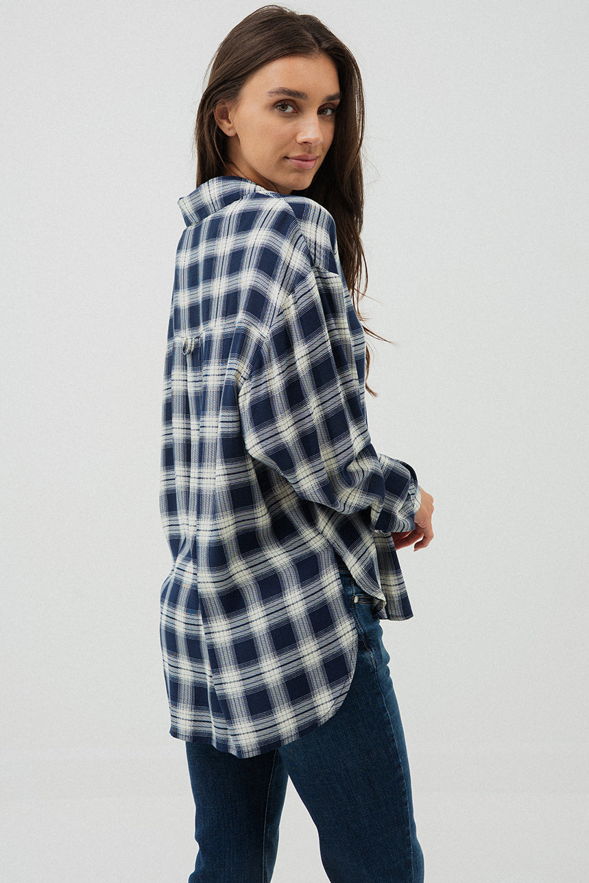 La blouse ample à carreaux se distingue par sa coupe décontractée et élégante, idéale pour un style casual-chic. Elle présente un col chemisier classique et une boutonnière pleine longueur à l’avant, tandis que ses manches longues se terminent par des poignets roulés une fois avec fente et bouton. Au dos, un pli creux central est rehaussé d’une boucle de suspension décorative, ajoutant une touche originale. Son ourlet droit est fendu sur les côtés, offrant confort et aisance de mouvement, parfait pour être portée seule ou superposée.