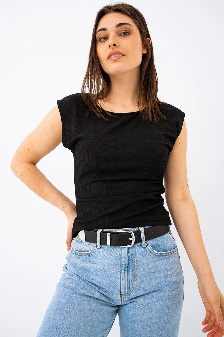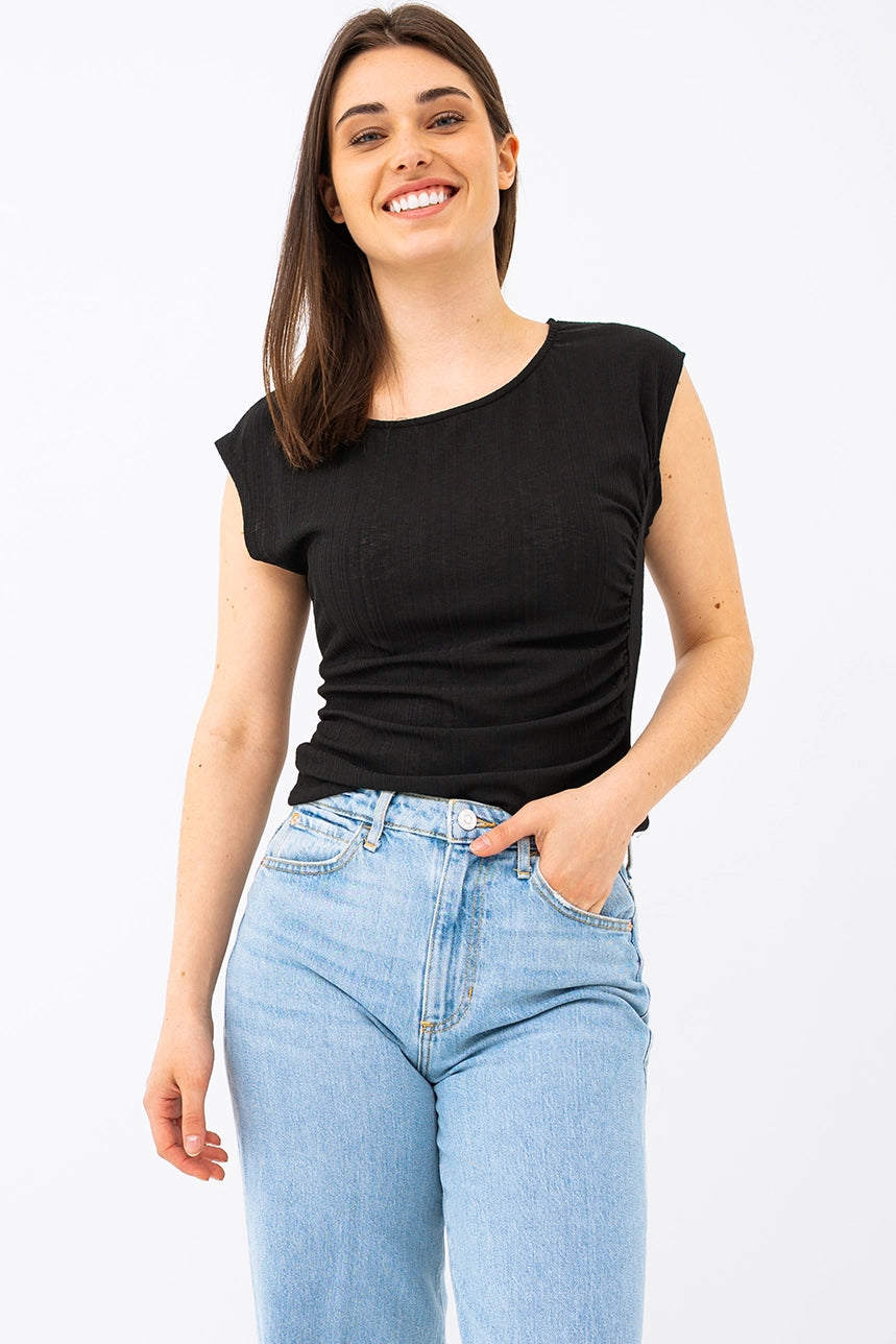 Un basique revisité pour un look féminin et confortable. Ce t-shirt à coupe ajustée met en valeur la silhouette avec ses fronces latérales délicates. Son tissu texturé extensible et léger assure un confort optimal, parfait pour tous les jours.