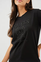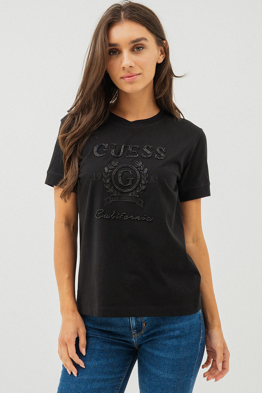 Le t-shirt Guess avec motif perlé adopte une coupe “Boxy” moderne qui lui confère un style décontracté et tendance. Il est doté d’un col rond classique et de manches courtes, parfaites pour un look estival ou superposé. Son design se distingue par une broderie raffinée agrémentée de perles décoratives, apportant une touche élégante et féminine. Confectionné dans une matière douce et confortable, il allie aisément style et bien-être au quotidien.