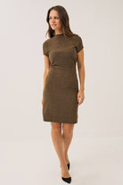 La robe scintillante présente une coupe légèrement ligne A avec une taille froncée sur les côtés pour un effet flatteur et féminin. Son col rond, conçu dans la même matière, s’accompagne d’une élégante fente fermée d’un bouton au dos. Avec ses manches courtes, son ourlet droit et sa longueur sous le genou, elle offre un style sophistiqué parfait pour les occasions spéciales.