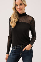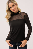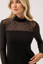 Le t-shirt noir à col montant et manches longues bi-matière présente une coupe ajustée pour mettre en valeur la silhouette. Le haut du buste et les manches sont réalisés en maille transparente décorée d’un motif à pois, ajoutant une touche d’élégance subtile. Confectionné dans une matière douce et extensible, il offre confort et liberté de mouvement tout au long de la journée.