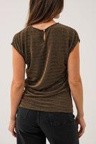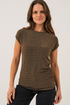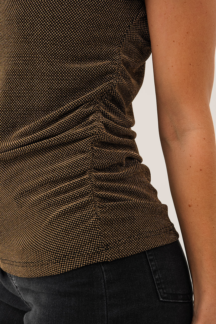 La blouse scintillante adopte une coupe droite avec un col rond légèrement bateau qui apporte une touche d’élégance moderne. Sans manches, elle présente des épaules tombantes et un joli froncé à la latérale gauche qui met subtilement la silhouette en valeur. Son ourlet droit et sa longueur aux hanches complètent une pièce lumineuse, parfaite pour rehausser une tenue.
