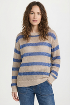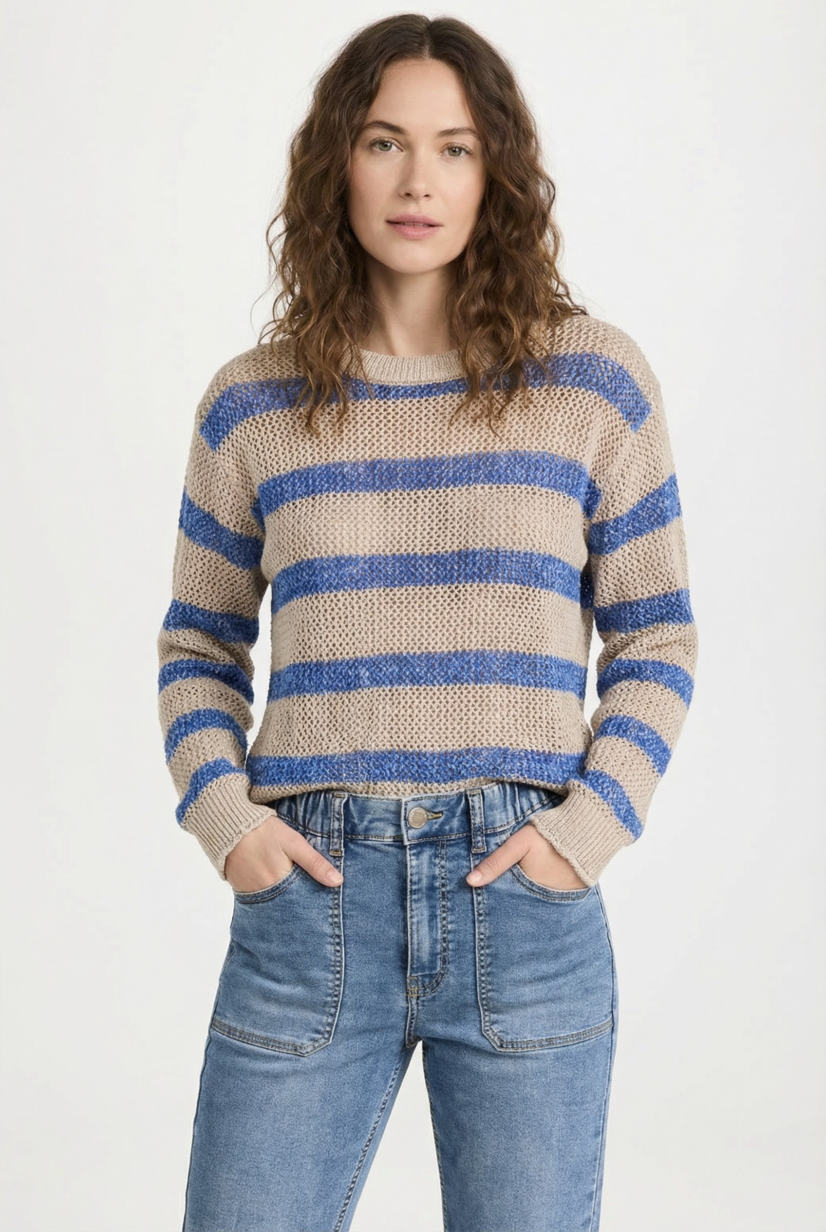 Ce chandail en maille ajourée est parfait pour ajouter une touche de style décontracté à vos tenues. Son motif à rayures bleues sur fond beige apporte un look frais et intemporel, idéal pour la mi-saison. Facile à porter, il se combine aussi bien avec un jean qu’un pantalon plus habillé.