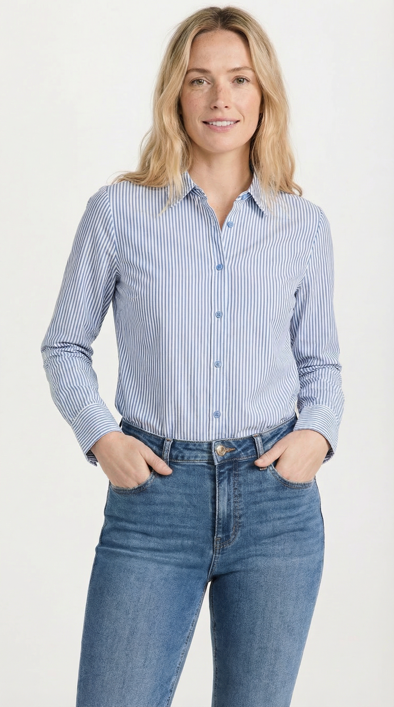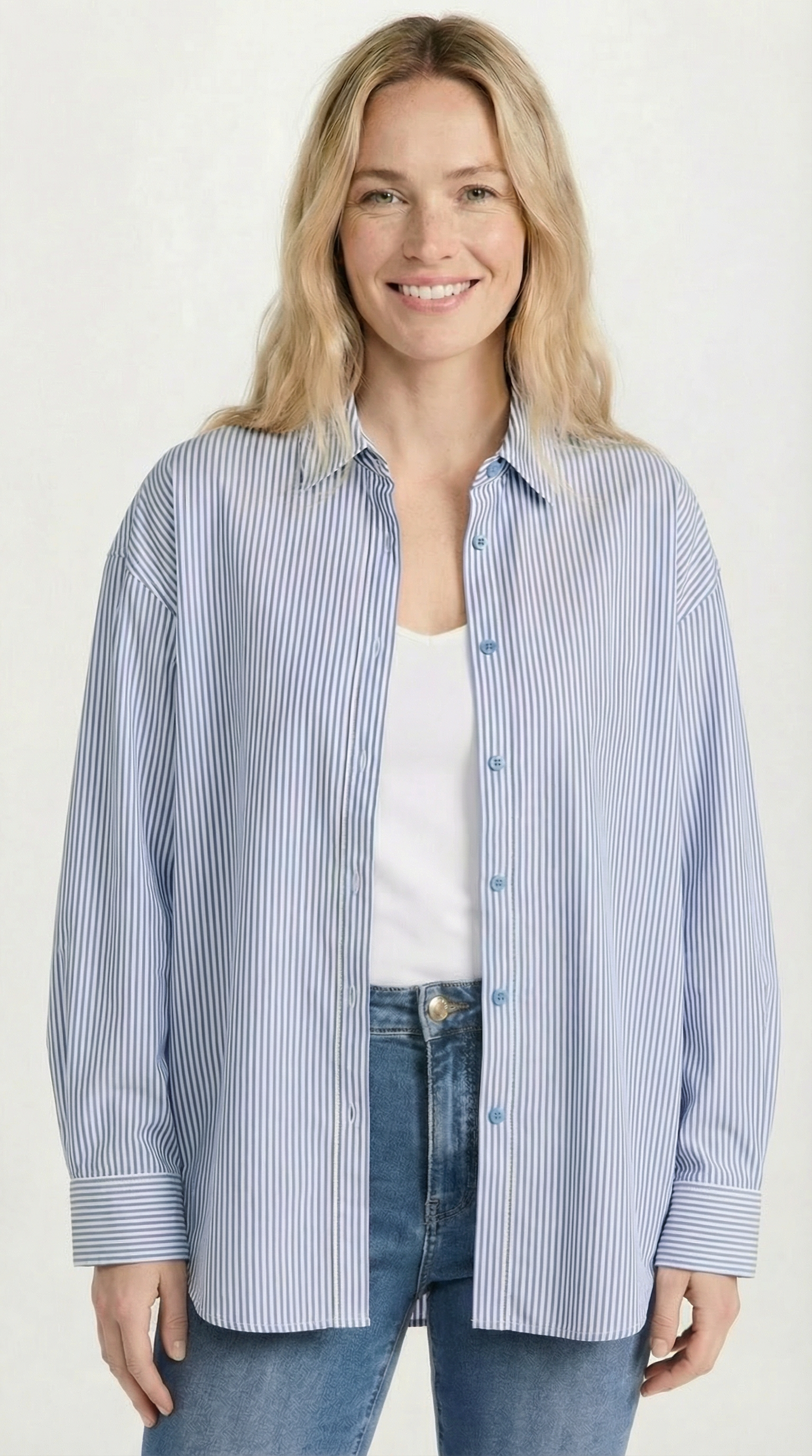 Cette chemise rayée revisite un grand classique avec une touche de fraîcheur et de légèreté, idéale pour la saison printanière. Sa coupe droite et ses fines rayures verticales créent une silhouette à la fois soignée et décontractée. Facile à porter seule ou en superposition, elle accompagne naturellement les transitions de saison, apportant une allure nette et lumineuse aux looks du quotidien.
