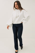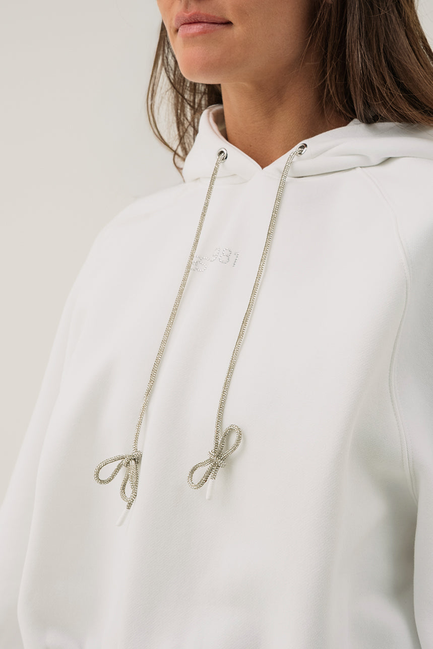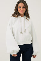 Ce chandail à capuche court adopte une coupe boxy moderne avec une encolure près du cou et une capuche confortable. Son dos est mis en valeur par un mélange d’imprimé, de broderie et de strass pour un style audacieux et tendance. Doté de manches longues bouffantes et d’un ourlet droit, il offre une silhouette actuelle avec une longueur aux hanches.