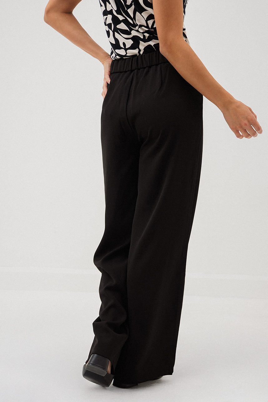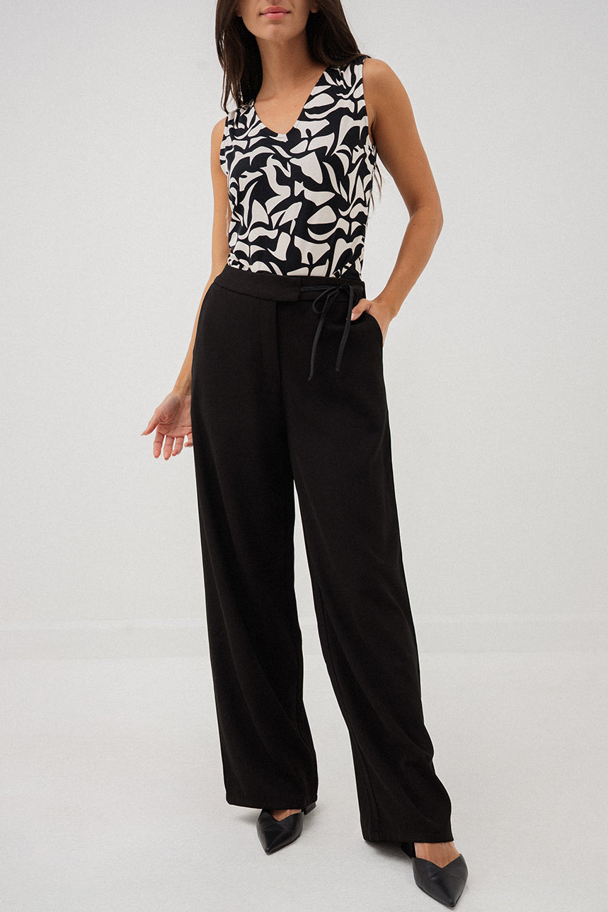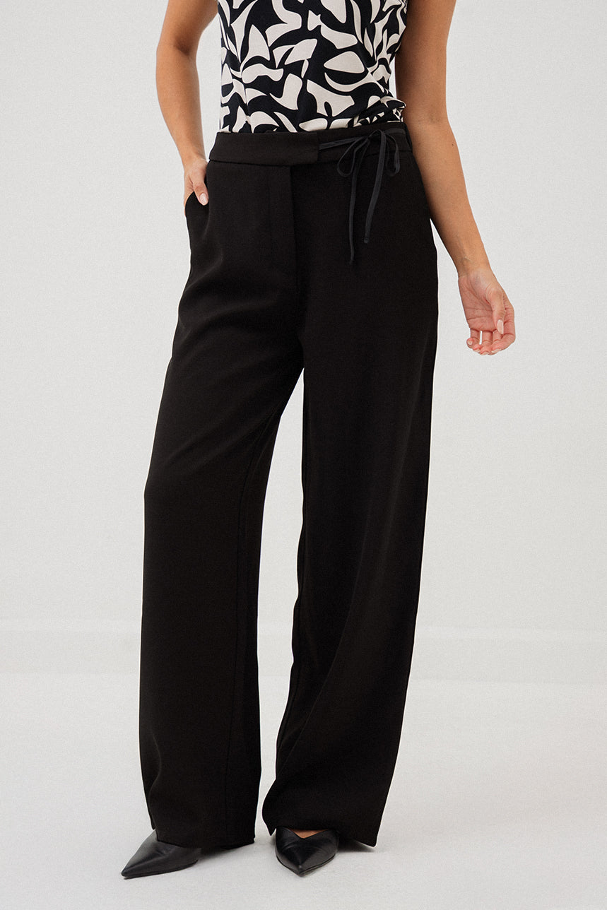 Le pantalon chic noir avec boucle à la ceinture est une pièce élégante qui allie confort et raffinement. Sa taille mi-haute flatte la silhouette, tandis que sa jambe large assure un tombé fluide et moderne. Il est doté d’une fermeture discrète à l’avant avec fermeture éclair, boutons et crochets, complétée par une ceinture à boucle en ruban qui souligne la taille avec subtilité. À l’arrière, une ceinture élastique offre plus de confort et d’ajustement. Pratique et stylé, il dispose de deux poches inclinées aux latérales, parfaites pour allier allure chic et fonctionnalité.