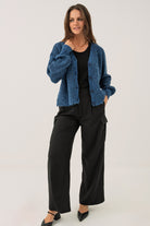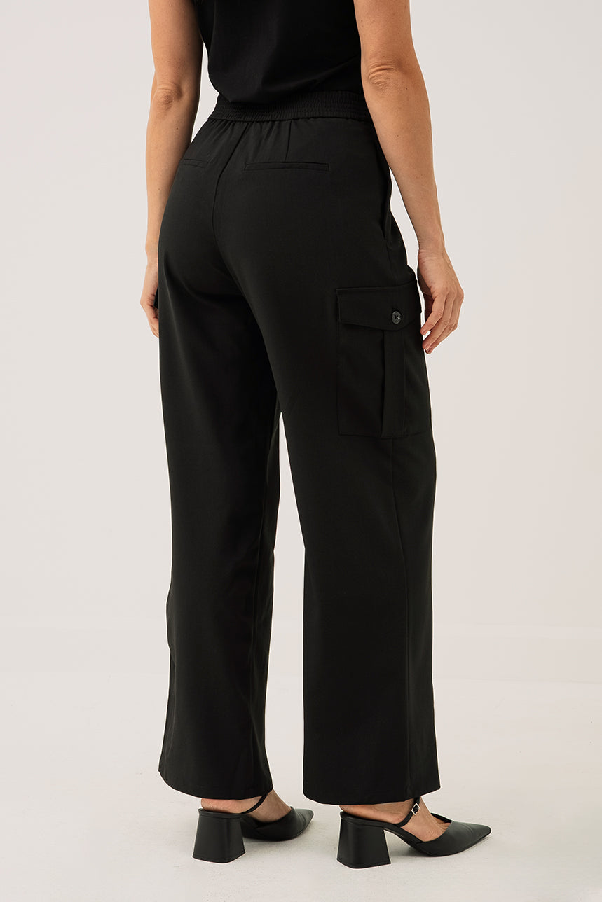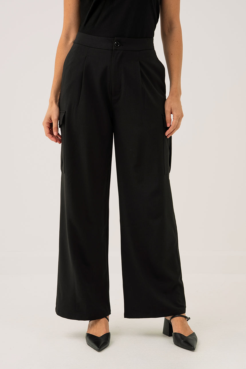 Le pantalon noir à poches cargo combine style pratique et confort optimal grâce à sa coupe ample et sa taille haute ajustée avec élastique au dos. Sa jambe large assure une belle fluidité, tandis que les différentes poches — deux fausses poches passepoilées à l’arrière, deux poches aux coutures latérales et deux poches cargo au-dessus du genou — ajoutent à la fois fonctionnalité et style. La fermeture éclair et le bouton à l’avant complètent ce modèle conçu dans une matière douce et confortable, offrant une belle tombée sur l’ensemble de la silhouette.