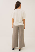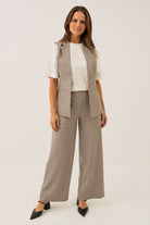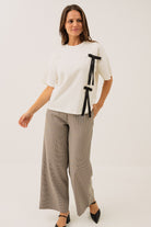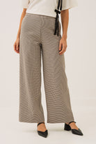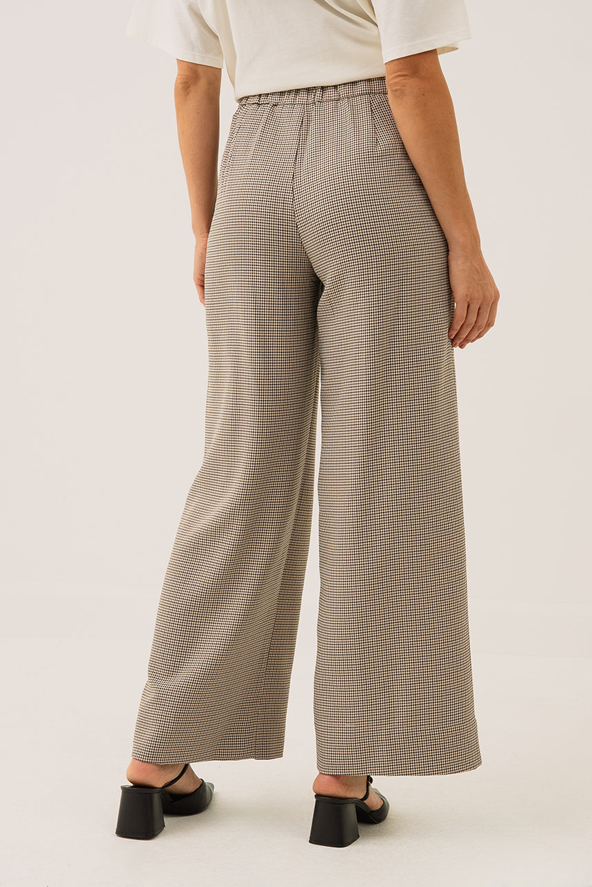 Le pantalon pied de poule brun arbore une coupe ample avec une taille régulière légèrement ajustée, rehaussée par une ceinture de 1 ½ pouce dotée d’un élastique au dos et de fronces pour un confort optimal. Sa jambe large assure liberté de mouvement et fluidité, tandis que les poches discrètement intégrées dans les coutures latérales ajoutent praticité et discrétion. La fermeture éclair invisible à la latérale gauche, accompagnée d’un bouton et d’un crochet, complète ce modèle alliant élégance et confort.