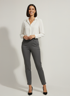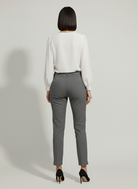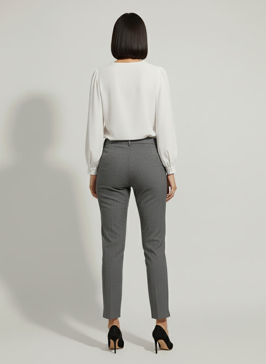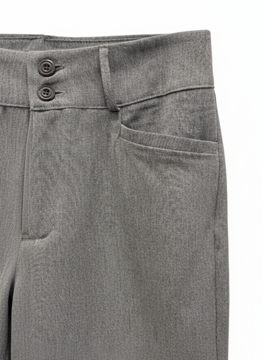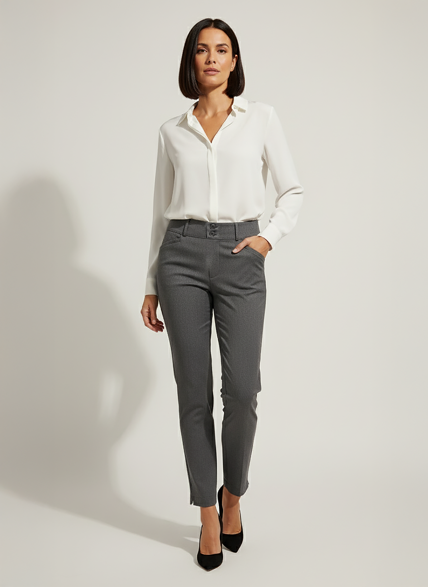 Ce pantalon taille haute à deux boutons offre une silhouette élégante grâce à sa coupe légèrement près de la jambe. Sa ceinture classique à cinq passants, ses poches en L à l’avant et ses pinces au dos assurent un tombé structuré et parfaitement ajusté. Avec sa fermeture à braguette et ses deux boutons à l’avant, il combine confort, maintien et style au quotidien.