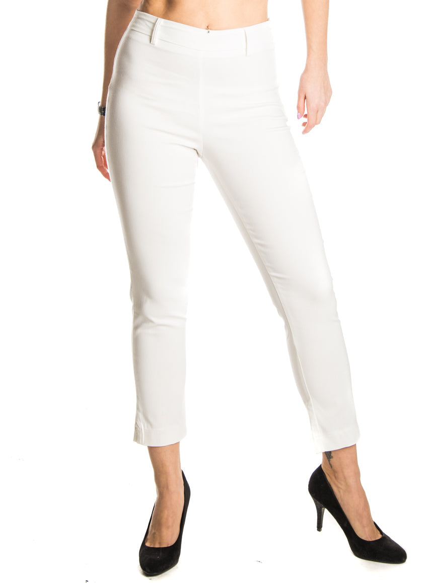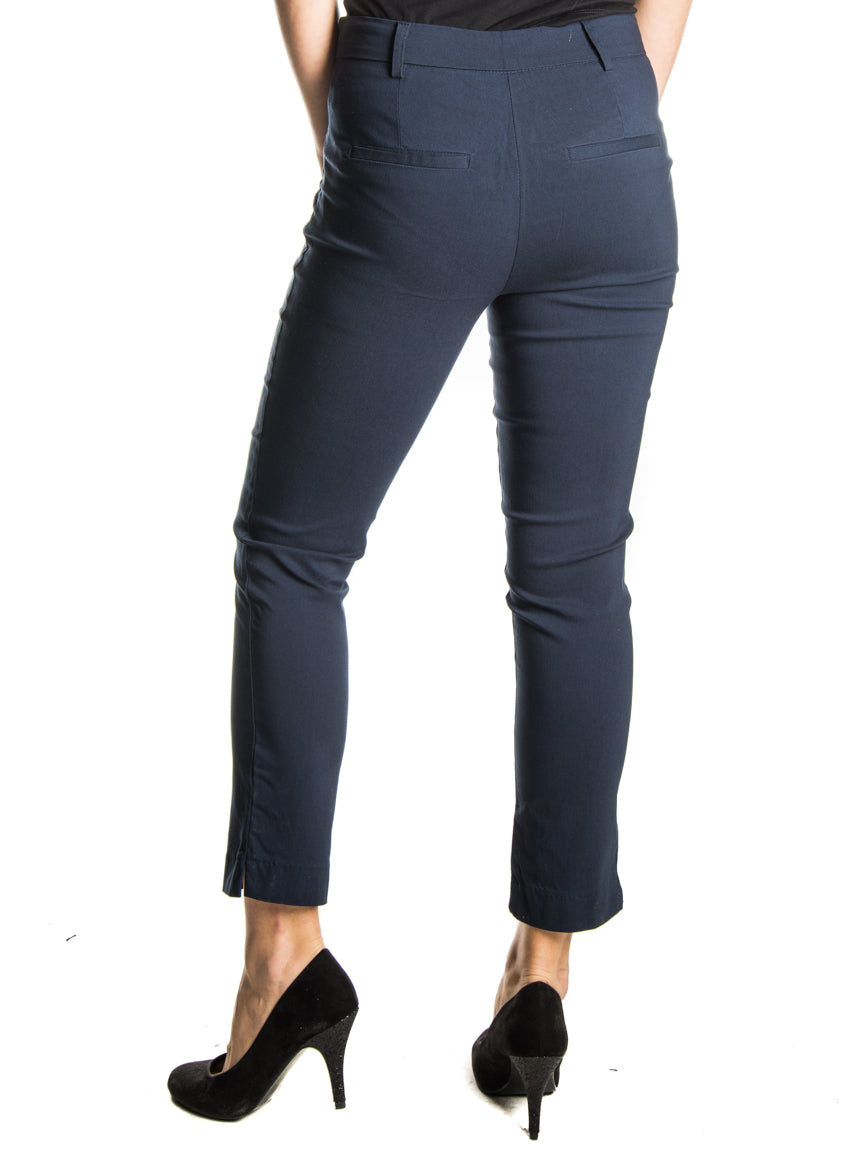 Pantalon taille haute à jambe droite. Fausses poches à l'arrière passepoilées. Fermeture sur le côté par zip dissimulé.
